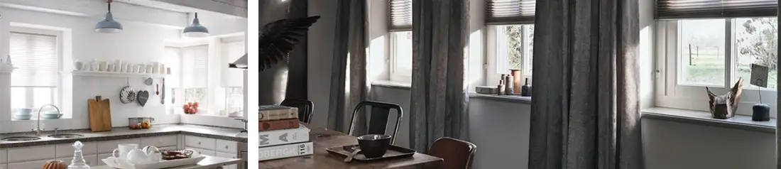 Een plissé is weer meer geschikt voor woonkamer en keuken omdat deze de mogelijkheid geeft om een stof te kiezen die (semi) transparant is. Zo blijft er zicht naar buiten maar is je raam wel sfeervol aangekleed. In combinatie met mooie overgordijnen of inbetweens een prachtige manier om je kamer helemaal af te maken.