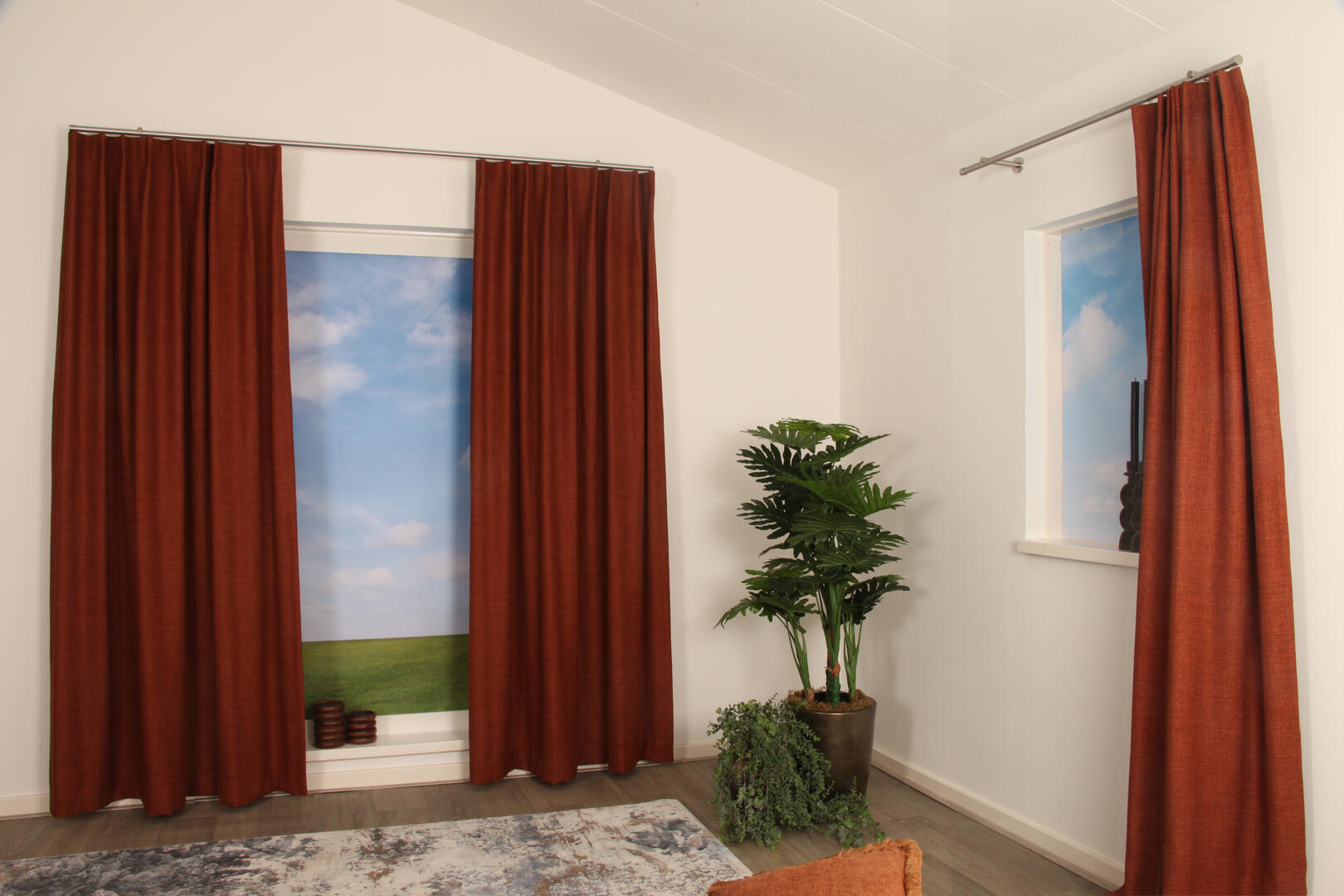De stof is kamerhoog, wat betekent dat deze gordijnen naadloos kunnen worden geconfectioneerd voor een luxe en elegante uitstraling.