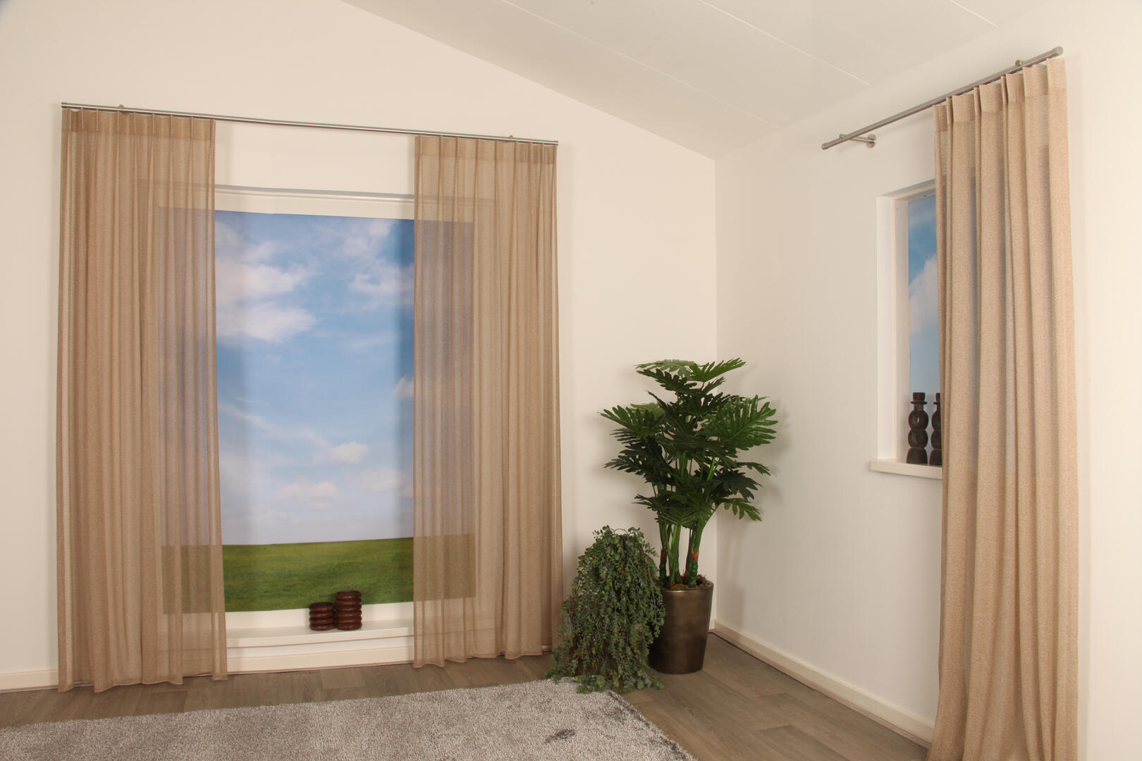 Deze stof is kamerhoog, wat betekent dat deze gordijnen naadloos kunnen worden geconfectioneerd voor een luxe en elegante uitstraling.