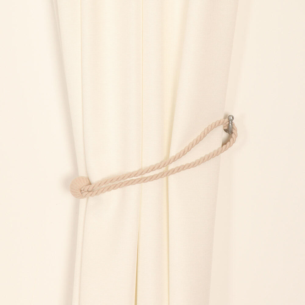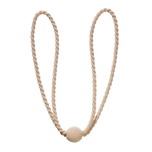 Embrasse van gevlochten koord in een zandkleur. Door de weving heeft de knop in het midden een gebreide look. De knop in het midden kan niet verschoven worden. Beide uiteinden van de embrasse zijn twee grote lussen voor een gemakkelijke bevestiging aan een embrassehaak. De embrasse heeft een totale lengte (recht gemeten) van 60cm.