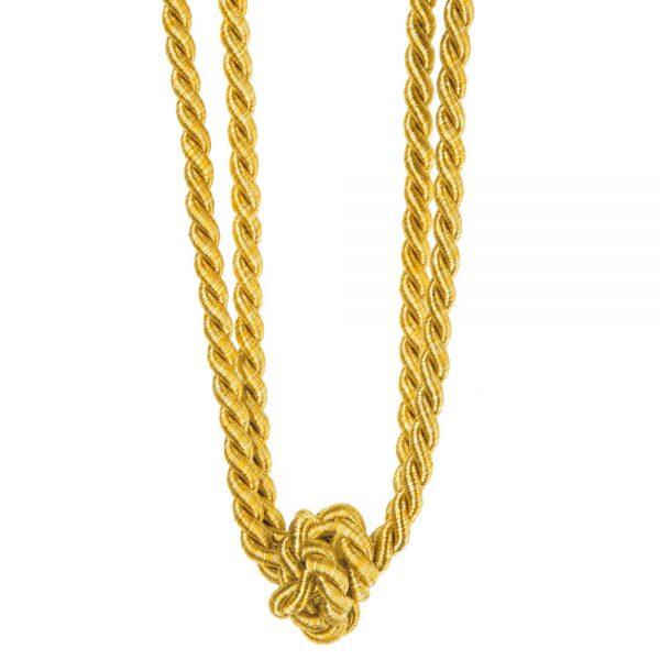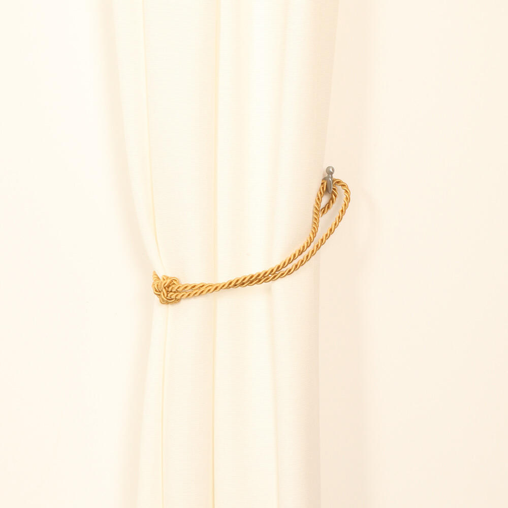 Deze glanzende kleinere embrasse in een gouden kleur geeft je gordijn net dat beetje chic! De fijne koorden van 6mm vormen samen een grote lus die in het midden geknoopt is. Hierdoor ontstaat een mooi detail. De lengte per lus is 30cm, de totale lengte van de embrasse is ongeveer 61cm.
