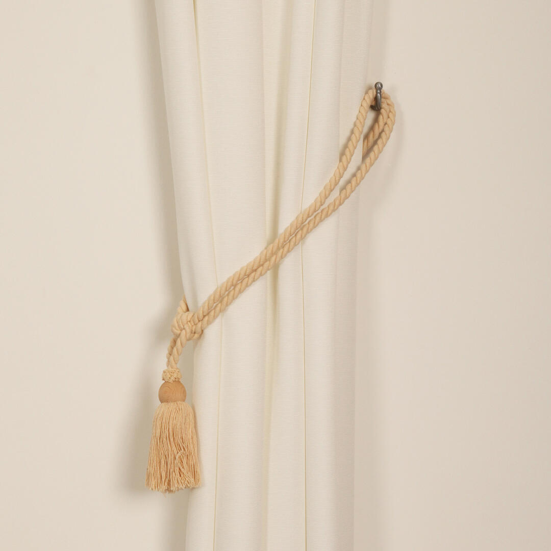 Embrasse met een matte look en een fijne structuur. Deze soepele embrasse is voorzien van 2 grote lussen van 35 cm. In het midden is de embrasse voorzien van een houten kraal met daaronder een kwast van 10 cm.