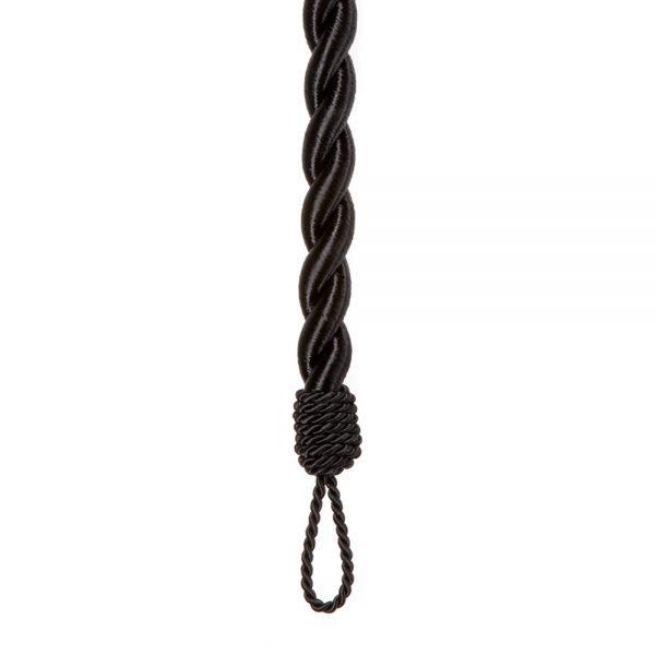 Glanzende zwarte embrasse van een gedraaid koord. Mooie soepele kwaliteit waarvan de uiteinden omwikkeld zijn met dunner gedraaid koord. Volledige lengte embrasse 81 cm incl. lussen. De dikte van het koord is 2 cm.