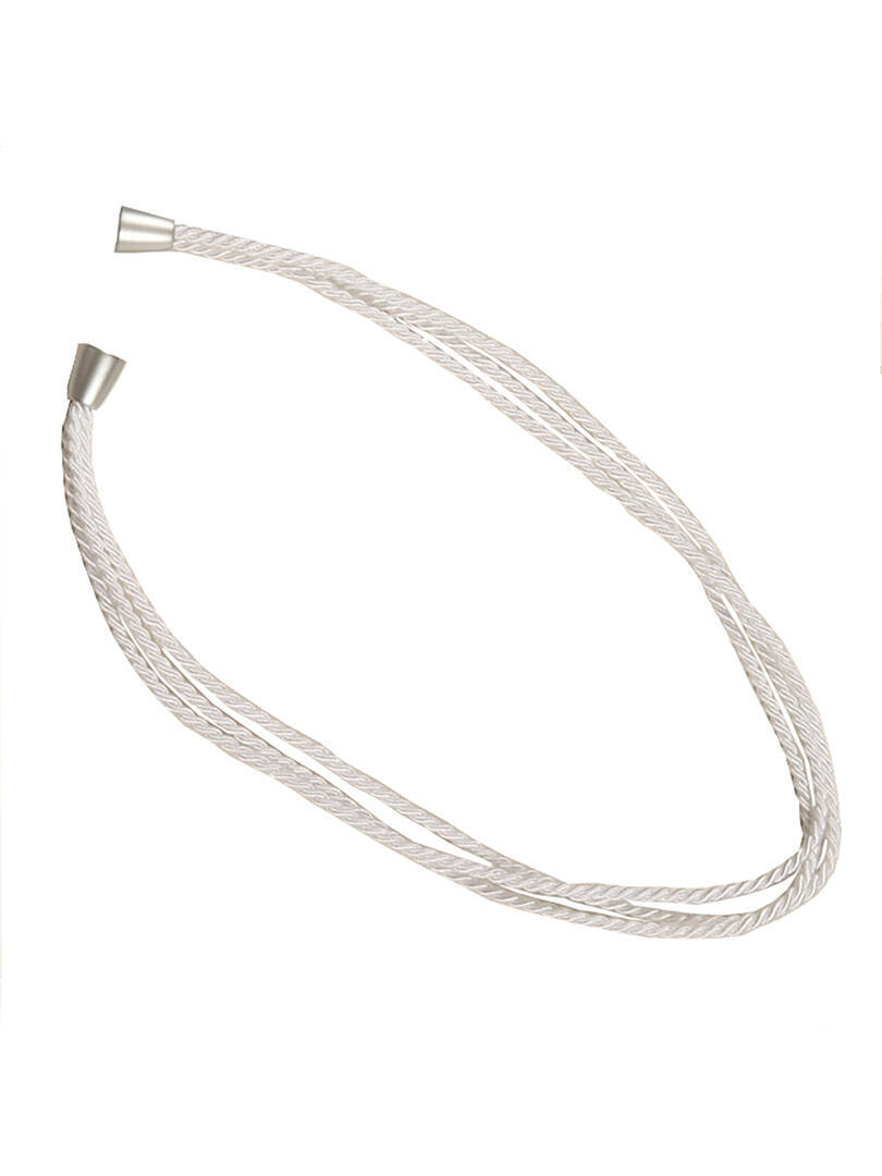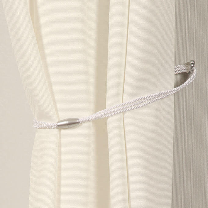 Glanzende embrasse in een witte kleur. De embrasse is gemaakt van drie dunnere gedraaide koorden en wordt gesloten d.m.v. magneten aan de uiteinden. De volledige lengte van de embrasse is 64 cm incl. magneet.