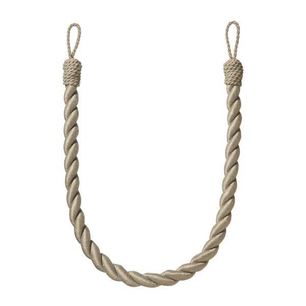 Zijdematte warmgrijze embrasse van een gedraaid koord. Mooie zachte kwaliteit waarvan de uiteinden omwikkeld zijn met dunner gedraaid koord. Deze embrasse dient te worden gebruikt in combinatie met een embrassehaak. Volledige lengte embrasse 80 cm incl. lussen.