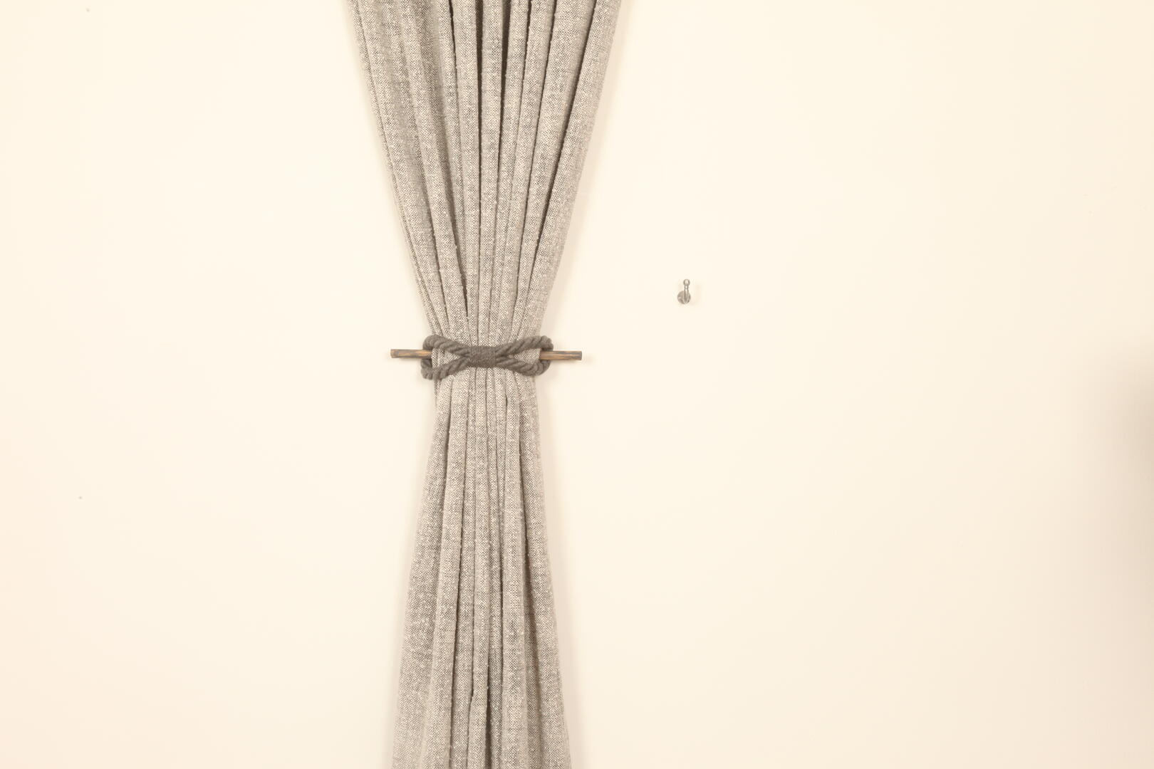 Een eigentijdse embrasse van gedraaid koord in vlindervorm met bamboe stok. In verband met de lengte van de embrasse is deze geschikt voor lichtere gordijnen of Inbetweens en voor smallere ramen. De embrasse zelf is ongeveer 22cm, het bamboestokje om de embrasse vast te zetten is ongeveer 24 cm.