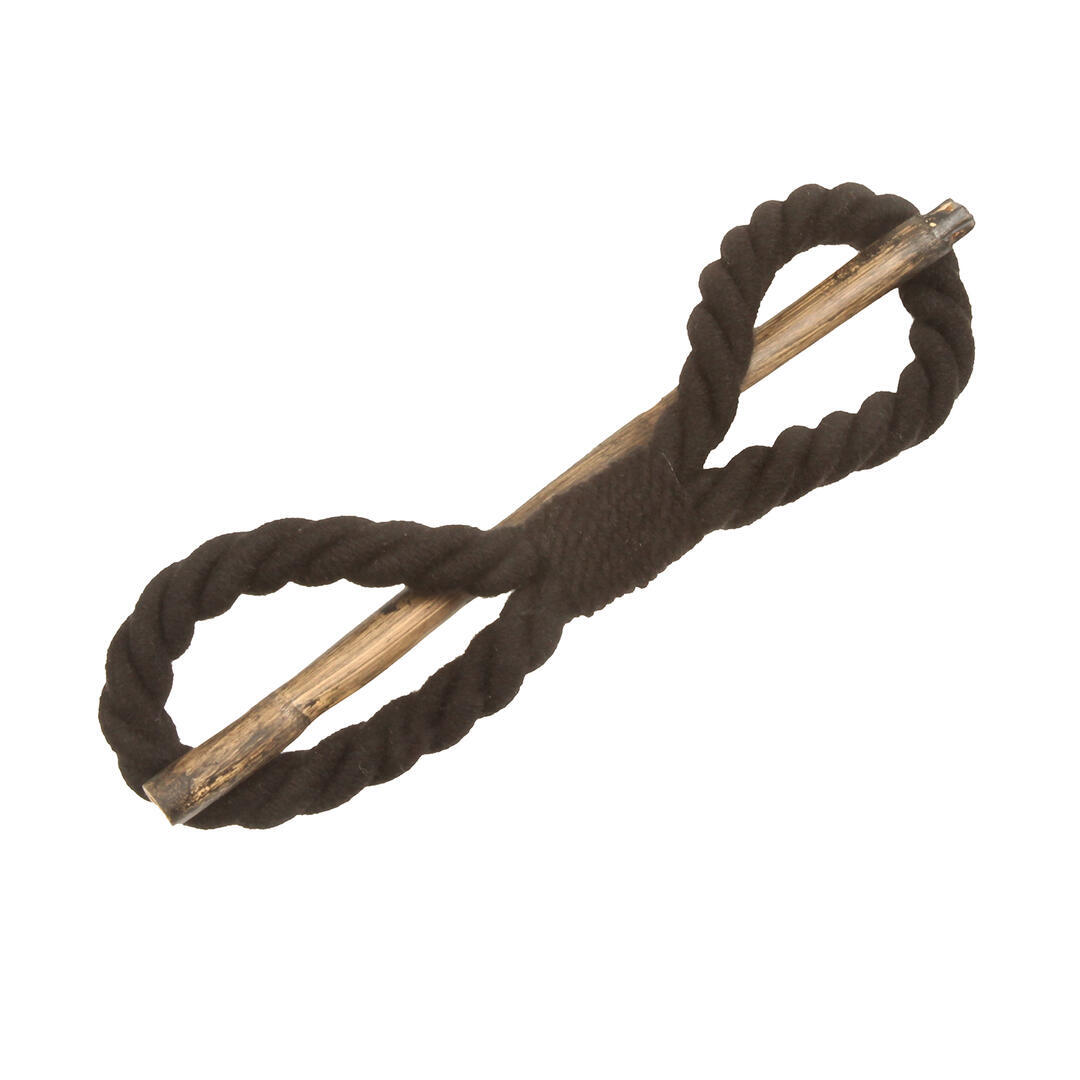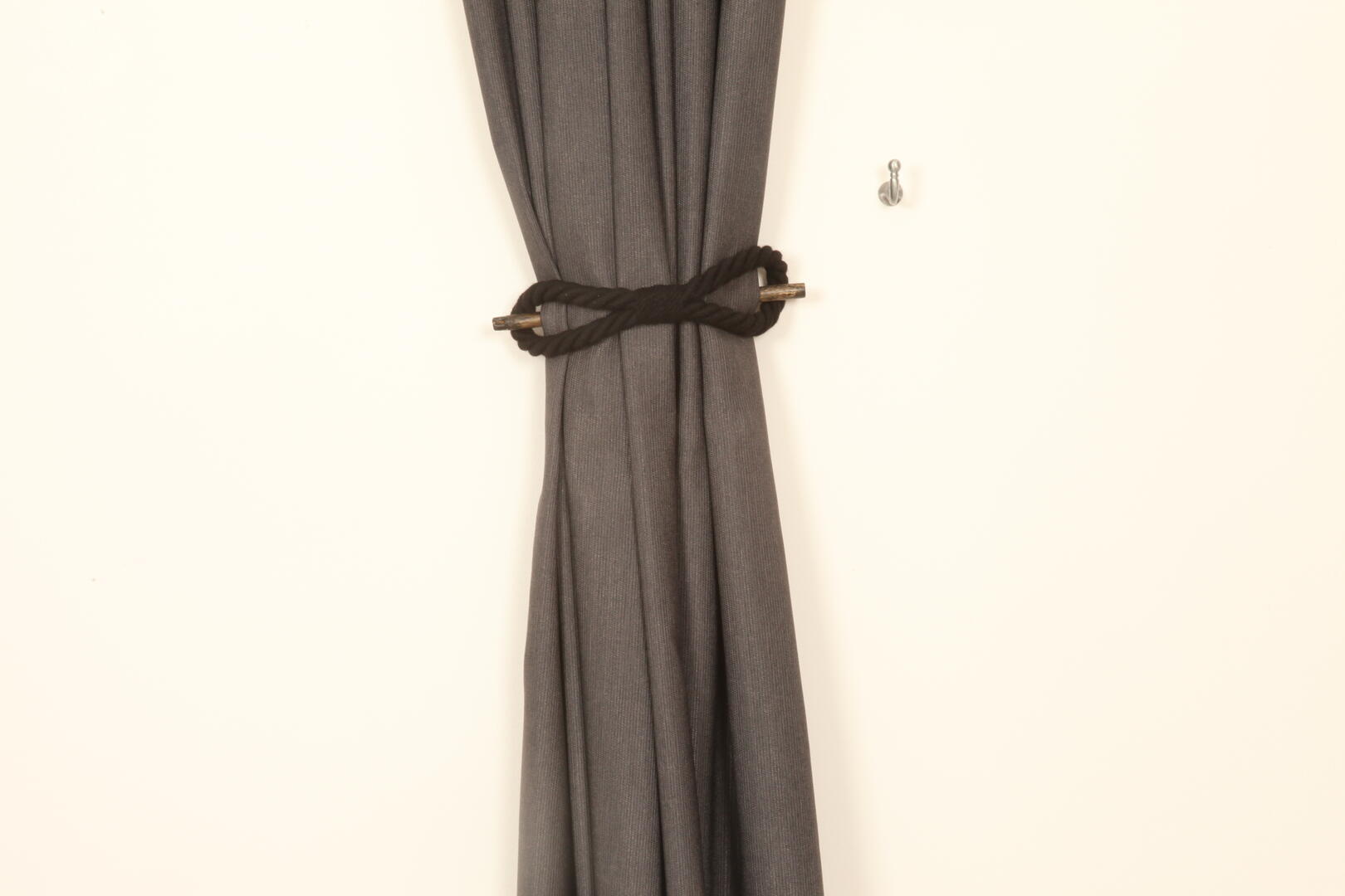Een eigentijdse embrasse van gedraaid koord in vlindervorm met bamboe stok. In verband met de lengte van de embrasse is deze geschikt voor lichtere gordijnen of Inbetweens en voor smallere ramen. De embrasse zelf is ongeveer 22cm, het bamboestokje om de embrasse vast te zetten is ongeveer 24 cm.