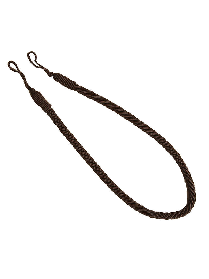 Bruine embrasse van glanzende gedraaide koorden, voorzien van ophanglusje van dunner koord. De lengte tussen de ophanglussen is 60 centimeter. De koorddikte is 1 centimeter.