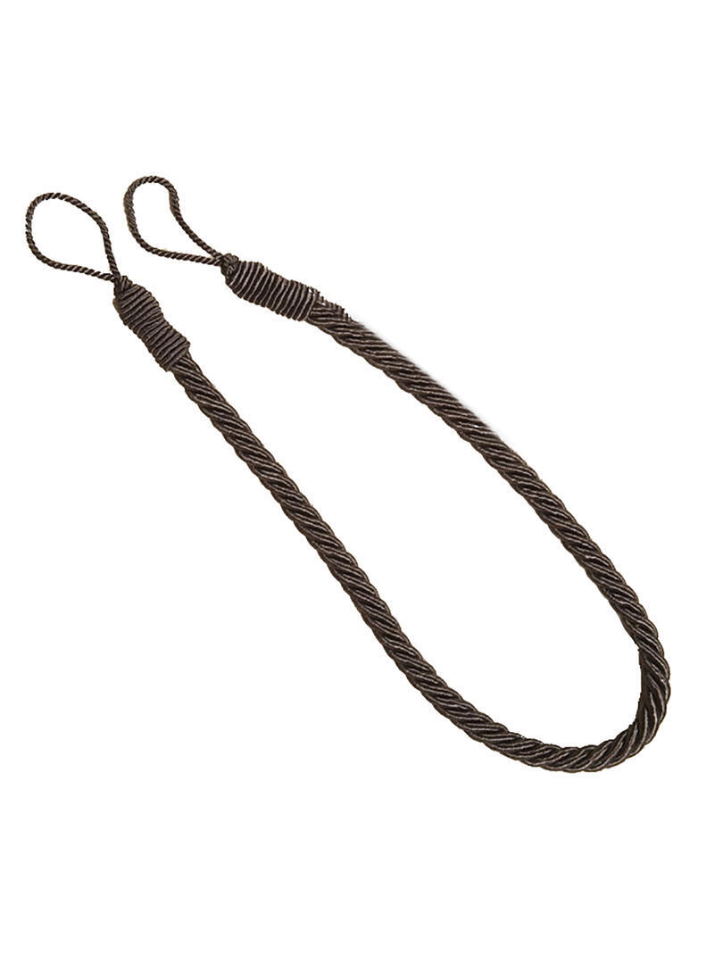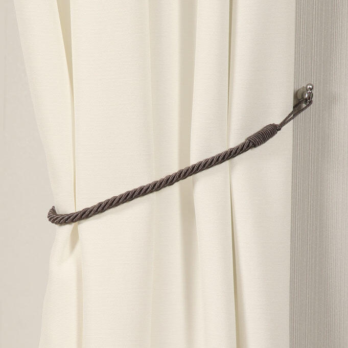 Grijze embrasse van glanzende gedraaide koorden, voorzien van ophanglusje van dunner koord. De lengte tussen de ophanglussen is 60 centimeter. De koorddikte is 1 centimeter.