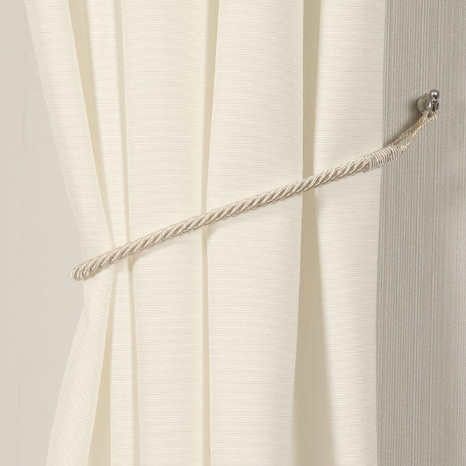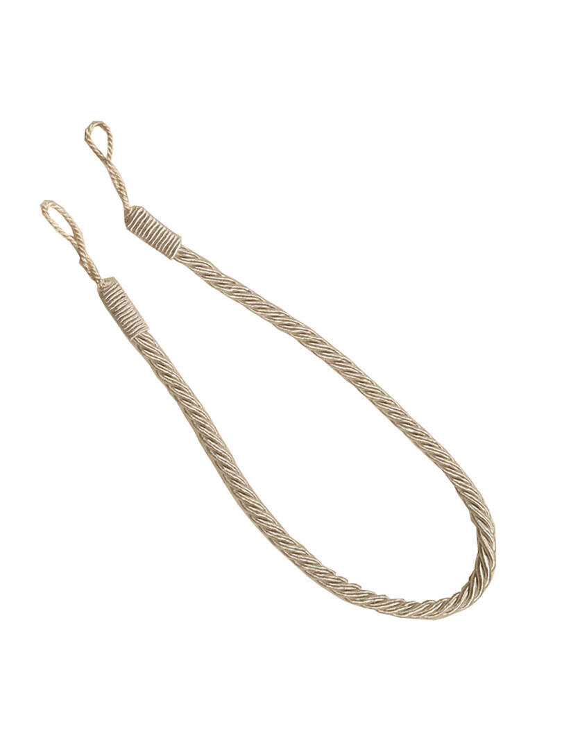 Naturelkleurige embrasse van glanzende gedraaide koorden, voorzien van ophanglusje van dunner koord. De lengte tussen de ophanglussen is 60 centimeter. De koorddikte is 1 centimeter.
