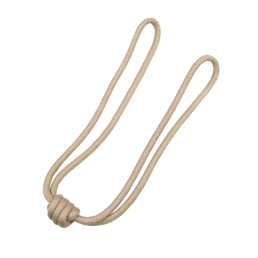 Embrasse met een glanzende look en een zeer fijne "gebreide" structuur. Deze soepele embrasse is voorzien van grote lussen. In het midden is de embrasse voorzien van een "drievoudige" knoop. De embrasse heeft een totale lengte van 64cm recht gemeten en een koorddikte van 1cm. Beide lussen zijn 30cm en de knoop is 4cm.