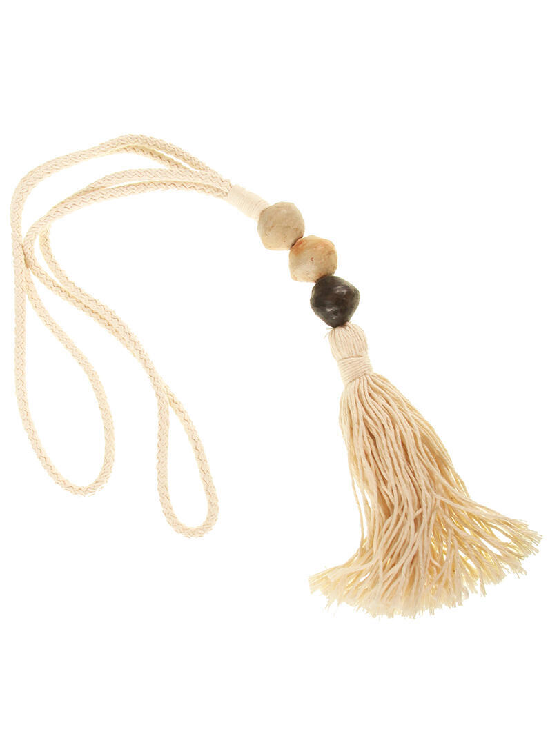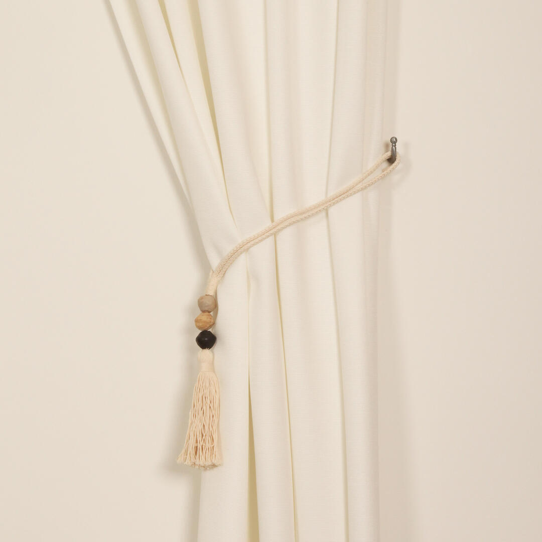 Cremekleurige embrasse met decoratiestenen en kwast. Mooie stoere uitstraling. De volledgie lenge van de embrasse is 55 cm. De luslengte is 33 cm en de kwast onder de decoratiestenen 15 cm.