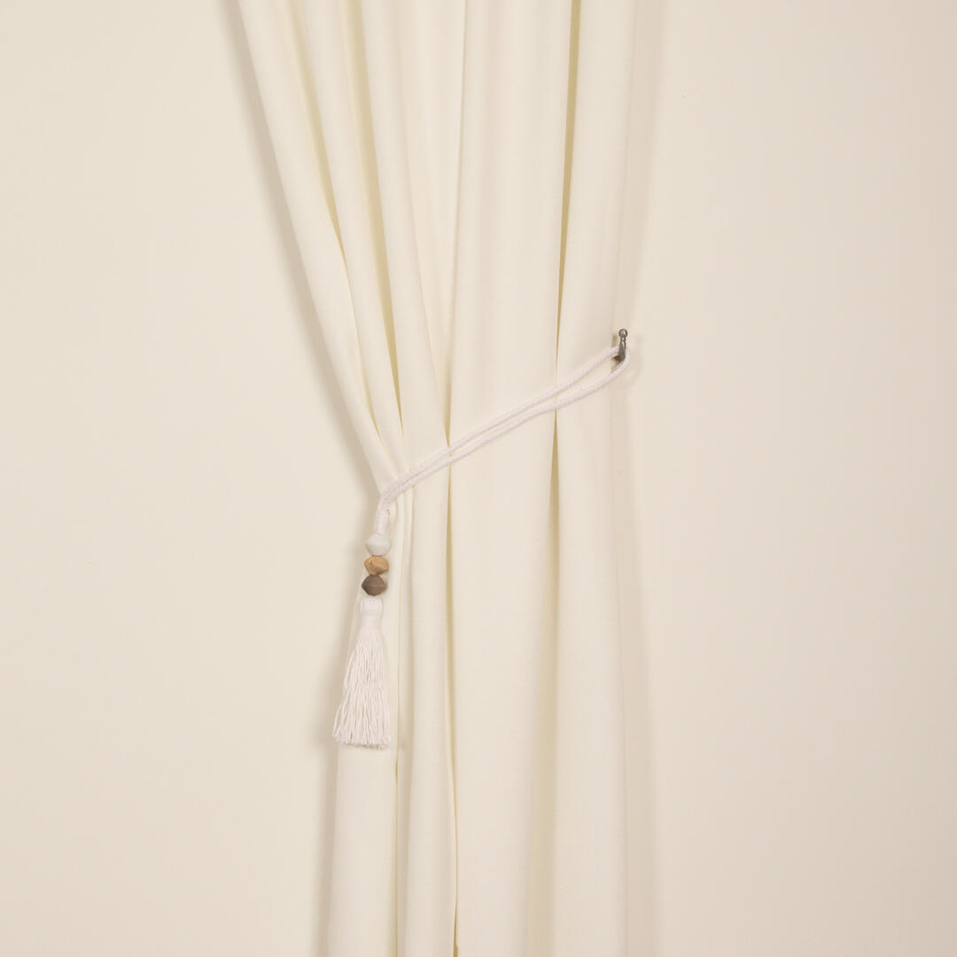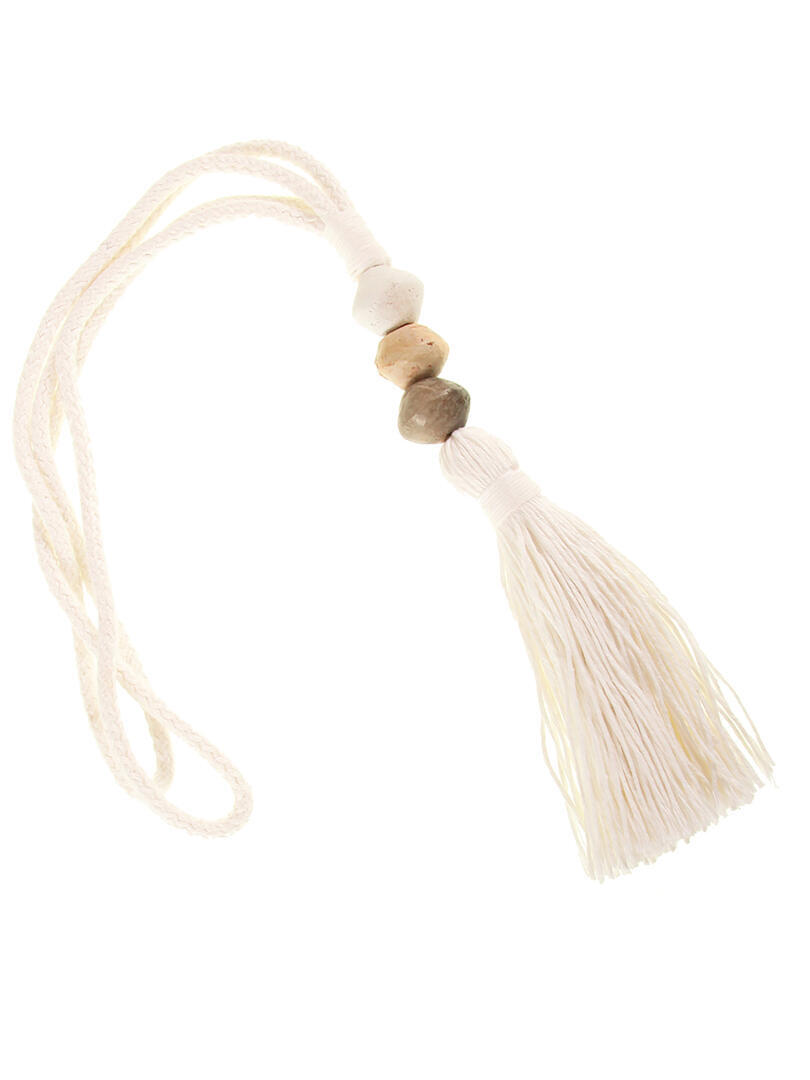 Witte embrasse met decoratiestenen en kwast. Mooie stoere uitstraling. De volledgie lenge van de embrasse is 55 cm. De luslengte is 33 cm en de kwast onder de decoratiestenen 15 cm.