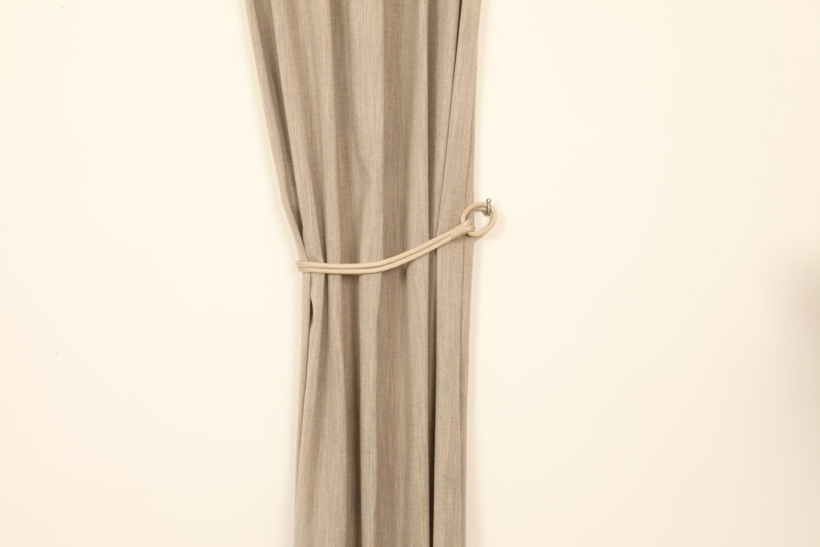 Een mooie embrasse van een dikker gevlochten koord in een lichtglanzend garen. De embrasse bevestig je met ringen aan het gordijn. De ringen zijn gemaakt van ditzelfde koord. Het koord heeft een dikte van 1cm en een lengte van 63cm. De totale lengte van de embrasse inclusief de ringen is 80cm.
