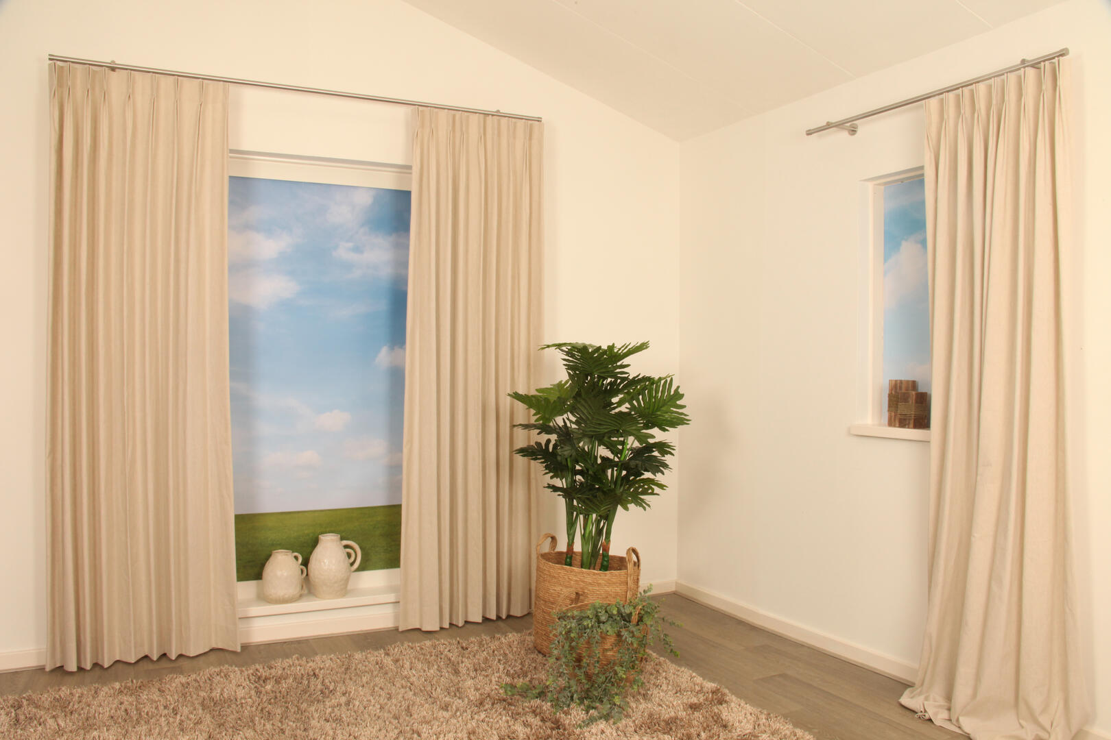 Deze kamerhoge afwerking biedt niet alleen esthetische voordelen, maar zorgt ook voor een betere lichtwering en een verbeterde geluidsisolatie, waardoor je huis een gevoel van sereniteit en rust uitstraalt. Deze stof is Oeko-Tex gecertificeerd.