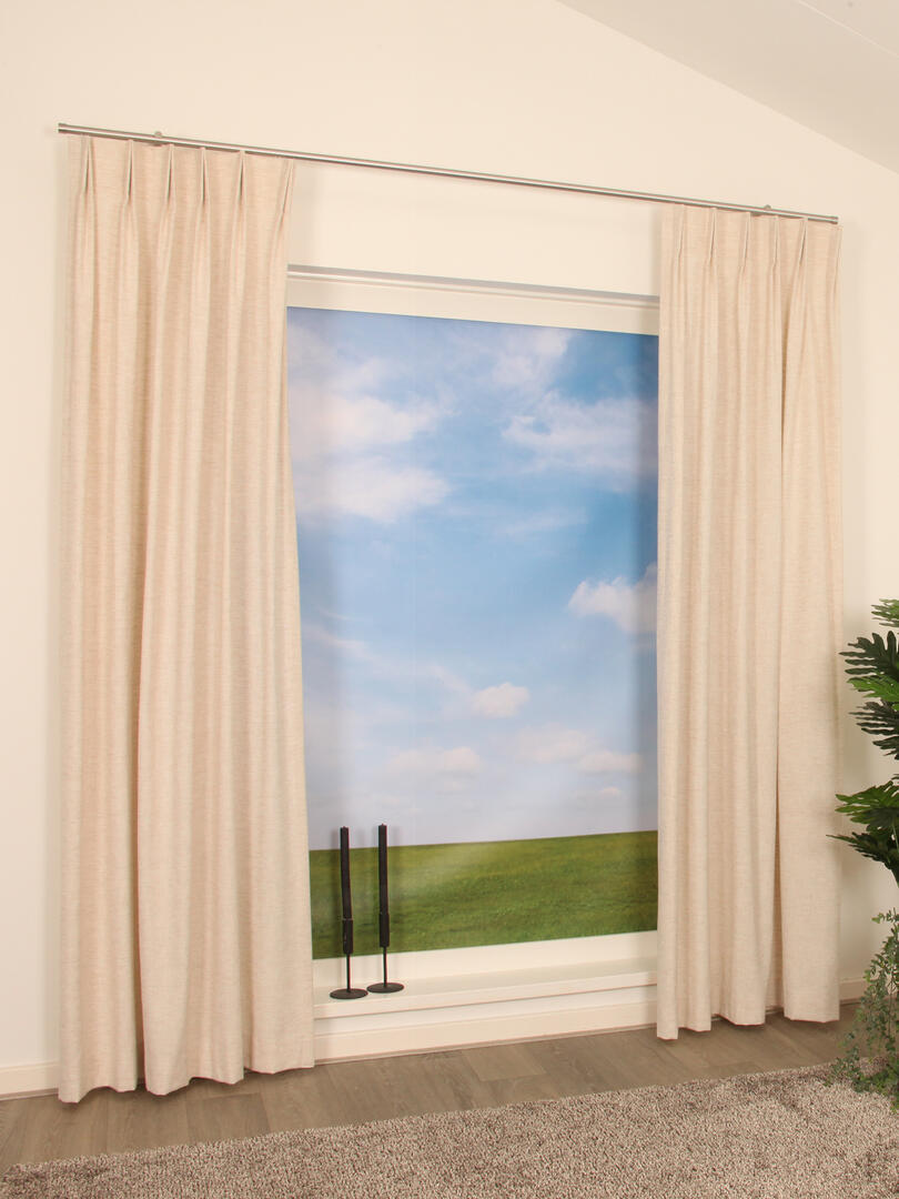 Dit gordijn hangt het mooist stotend dus net op de grond of slepend dus ruim op de grond.
