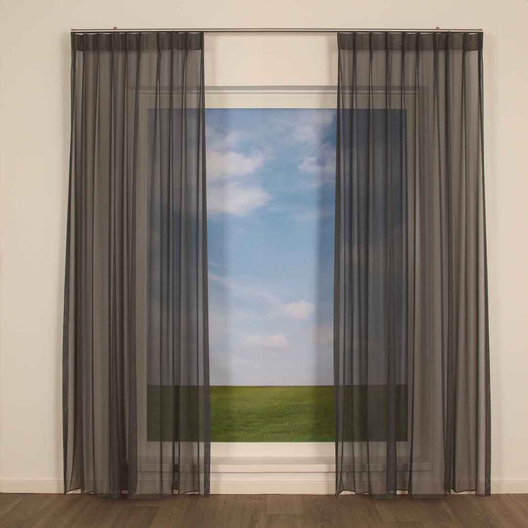 Deze vitrage is kamerhoog, wat betekent dat deze gordijnen naadloos kunnen worden geconfectioneerd voor een luxe en elegante uitstraling.