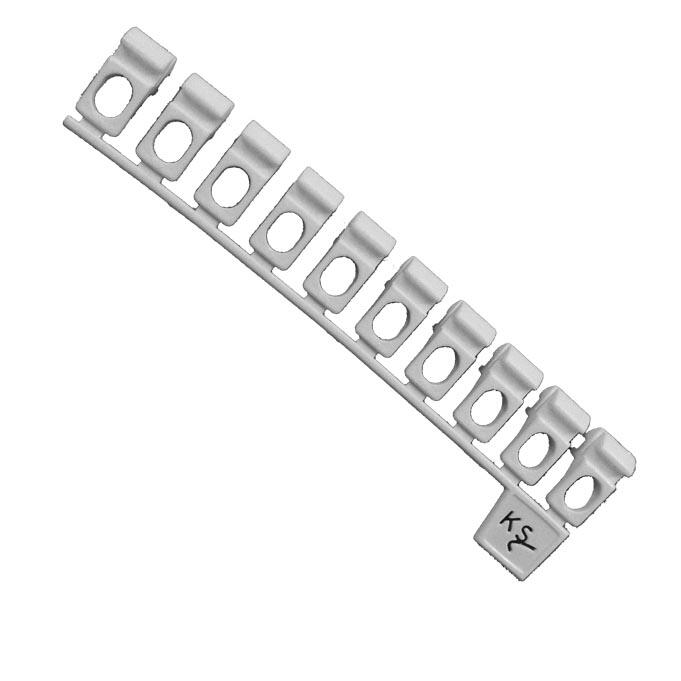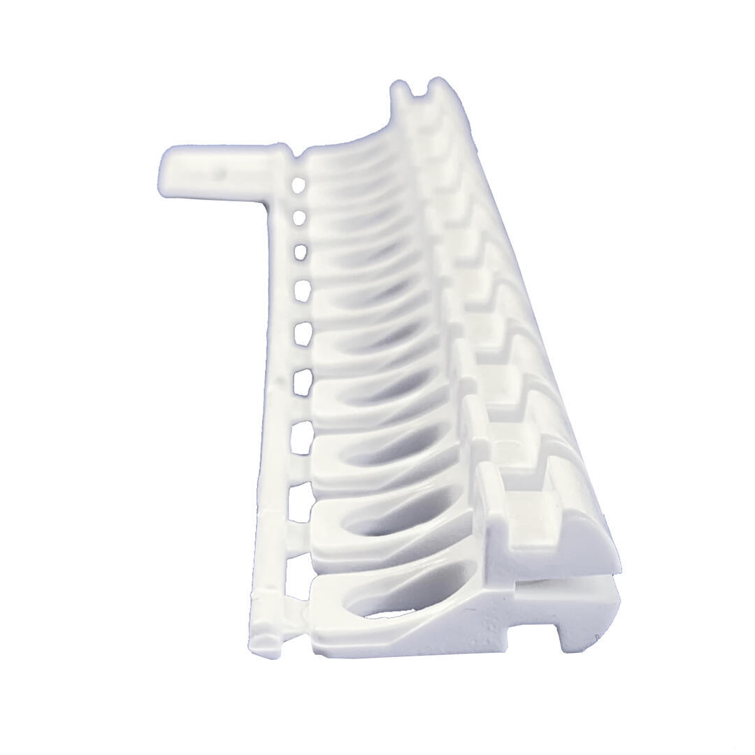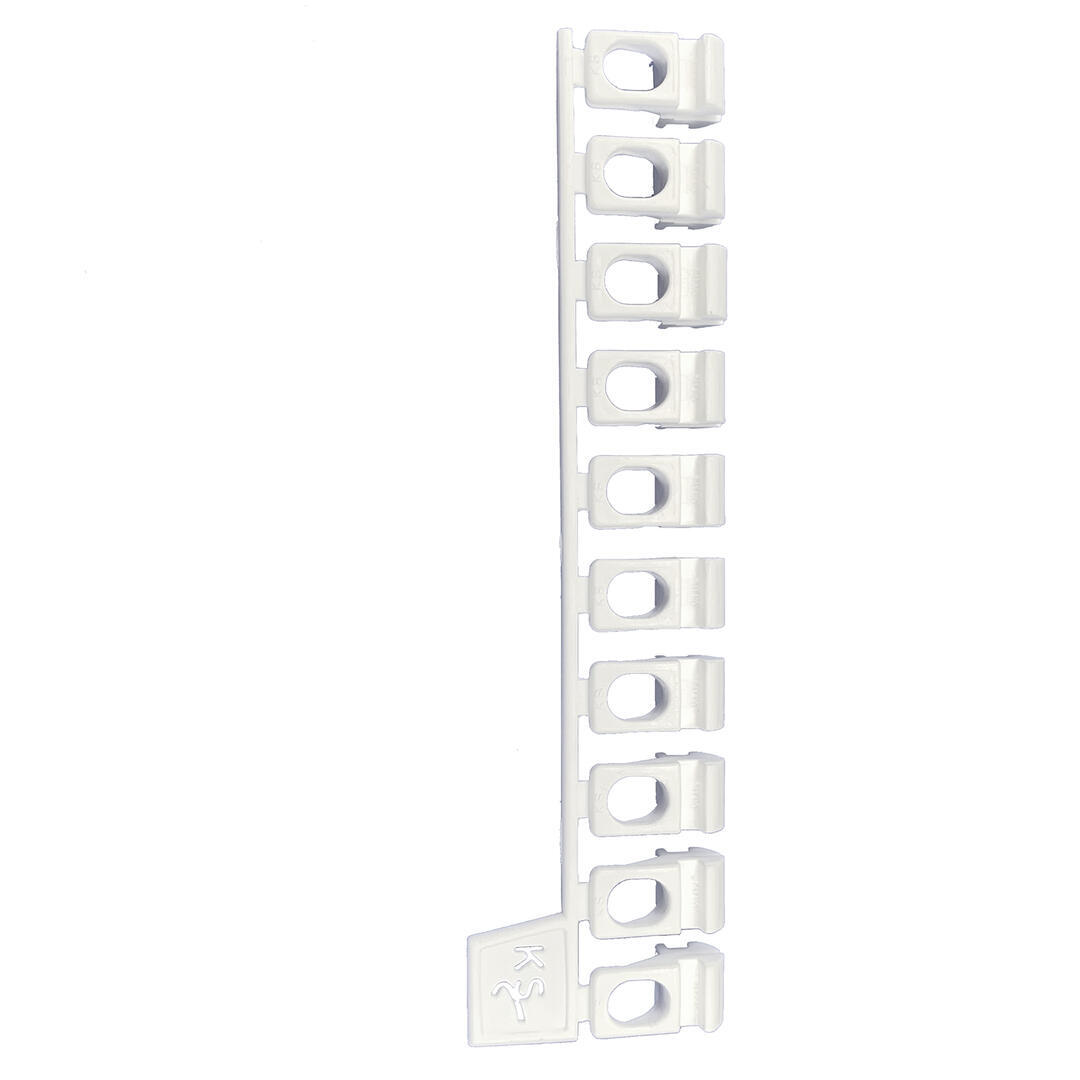 Strip met 10 asymmetrische glijders in de kleur wit voor KS en DS gordijnrail. Door deze vorm hangen de gordijnen mooi voor de rails.