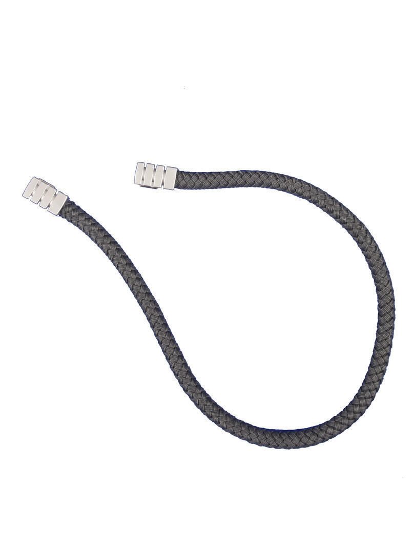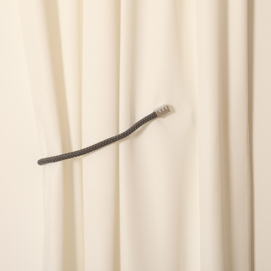 Embrasse van een dikker gevlochten koord in een lichtglanzend garen. Het koord komt uit in een mat zilveren magneethouder met inkepingen. De embrasse wordt met de magneten aan het gordijn bevestigd. Het koord heeft een dikte van 1,4cm en een lengte van 67cm. De totale lengte van de embrasse inclusief de magneethouders is 74cm.