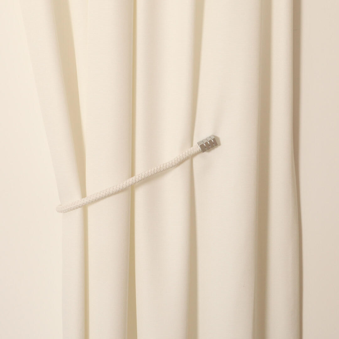Embrasse van een dikker gevlochten koord in een lichtglanzend garen. Het koord komt uit in een mat zilveren magneethouder met inkepingen. De embrasse wordt met de magneten aan het gordijn bevestigd. Het koord heeft een dikte van 1,4cm en een lengte van 67cm. De totale lengte van de embrasse inclusief de magneethouders is 74cm.