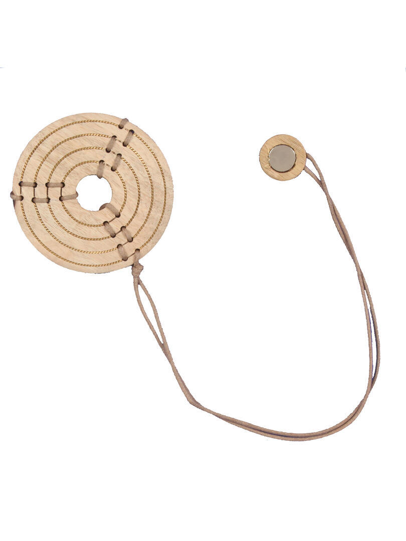 Magneet embrasse uitgevoerd in hout, doorvlochten met koord. Hetzelfde koord vormt de verbinding met het tweede deel van de embrasse. De knop aan de voorzijde is gedecoreerd met ringen van dun, gedraaid, metaal. De houten knop heeft een buitenmaat van 9,5cm en in het midden een opening. Het koord heeft een lengte van 34 cm.