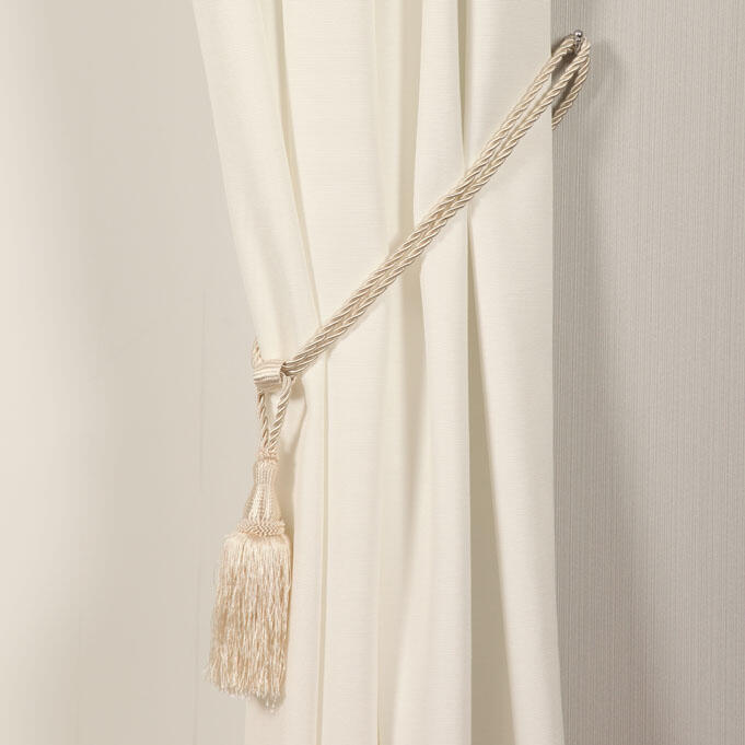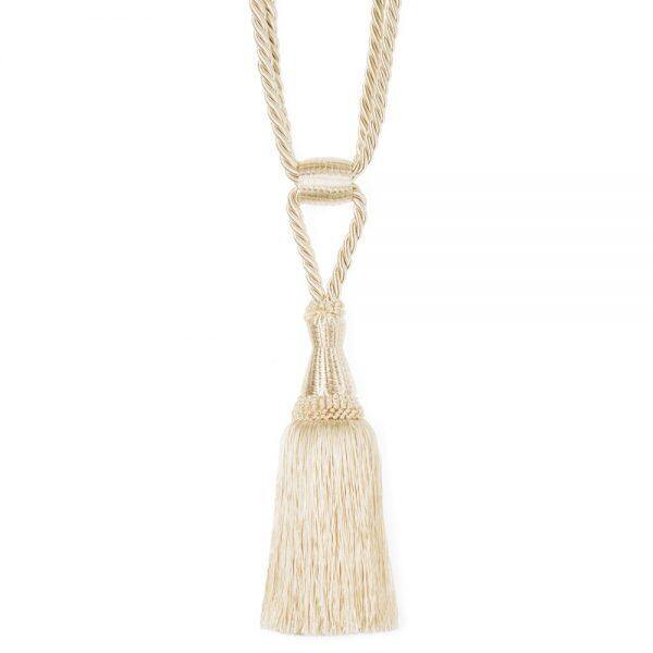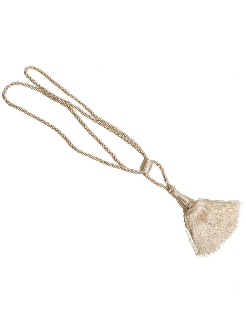 Naturel embrasse met een grote kwast en twee lange lussen. De volledige lengte van de embrasse is ongeveer 65 cm. De lengte van de kwast tot het begin van het koord is 20 cm. Deze embrasse is te gebruiken in combinatie met een embrassehaak.