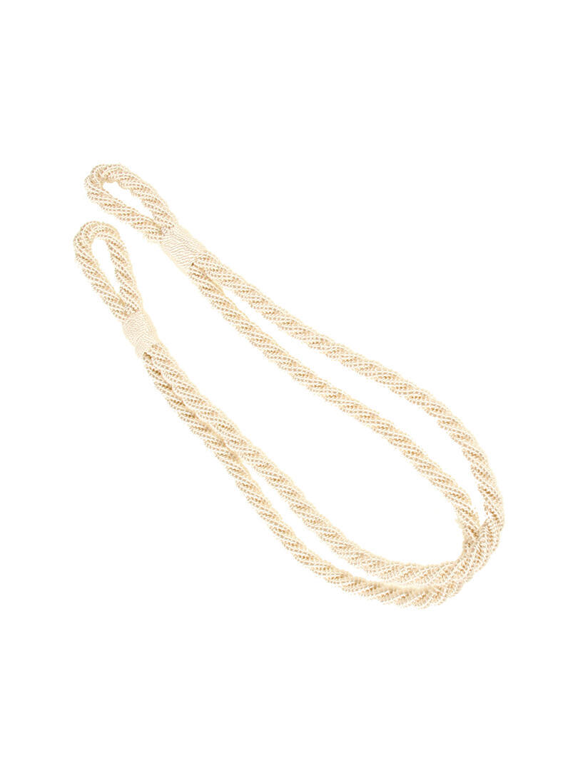 Glanzende naturelkleurige embrasse van twee gedraaide koorden. Mooie kwaliteit waarvan de uiteinden omwikkeld zijn met dunner koord. Bij deze embrasse wordt een grote embrassehaak aangeraden. De volledige lengte van de embrasse is 81 centimeter inclusief lussen.