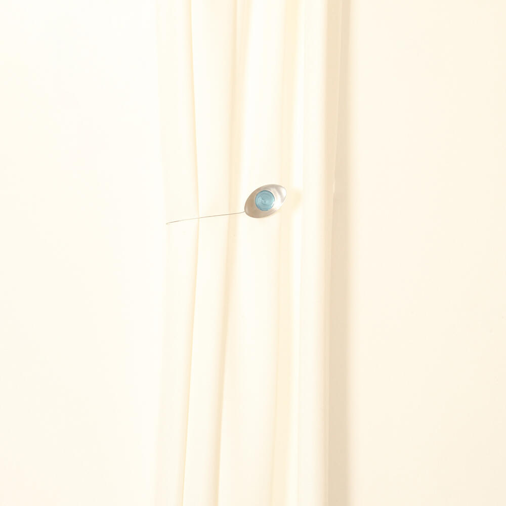 Magneet embrasse van staaldraad met een grote metalen knop in een ovale vorm aan de voorzijde, met daarin een ronde vorm van blauwe epoxy en aan de achterzijde een kleinere halfronde knop. De knoppen zijn voorzien van sterke magneten.