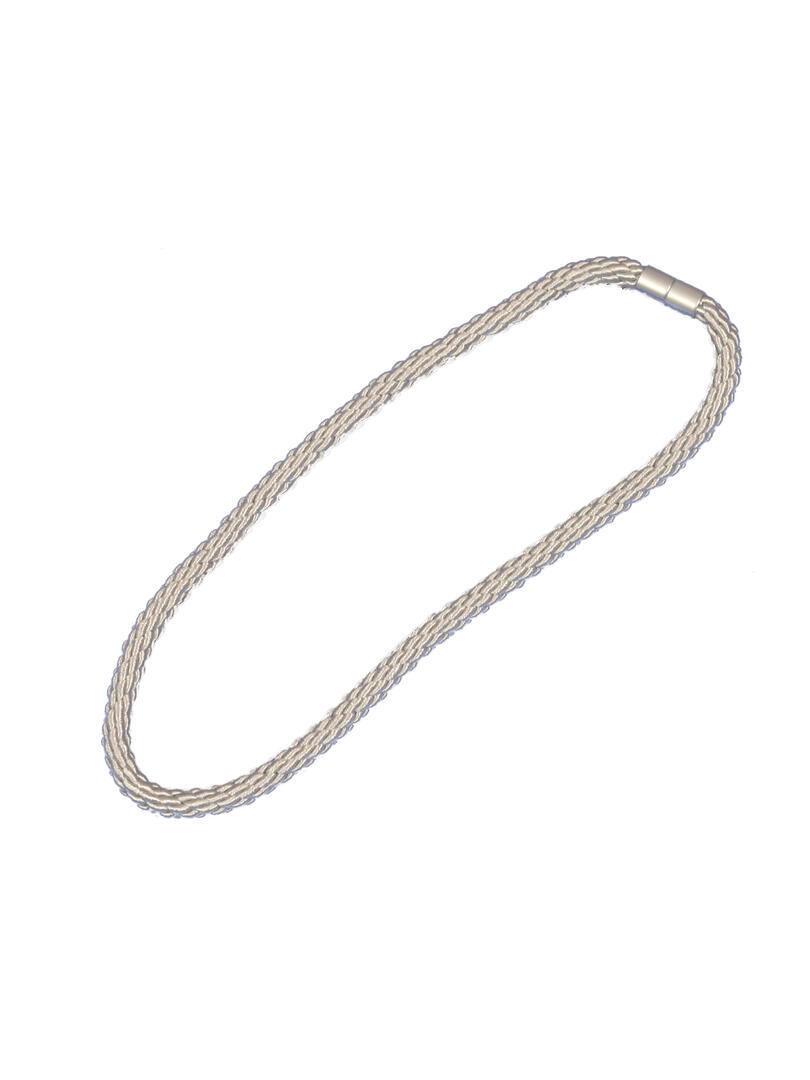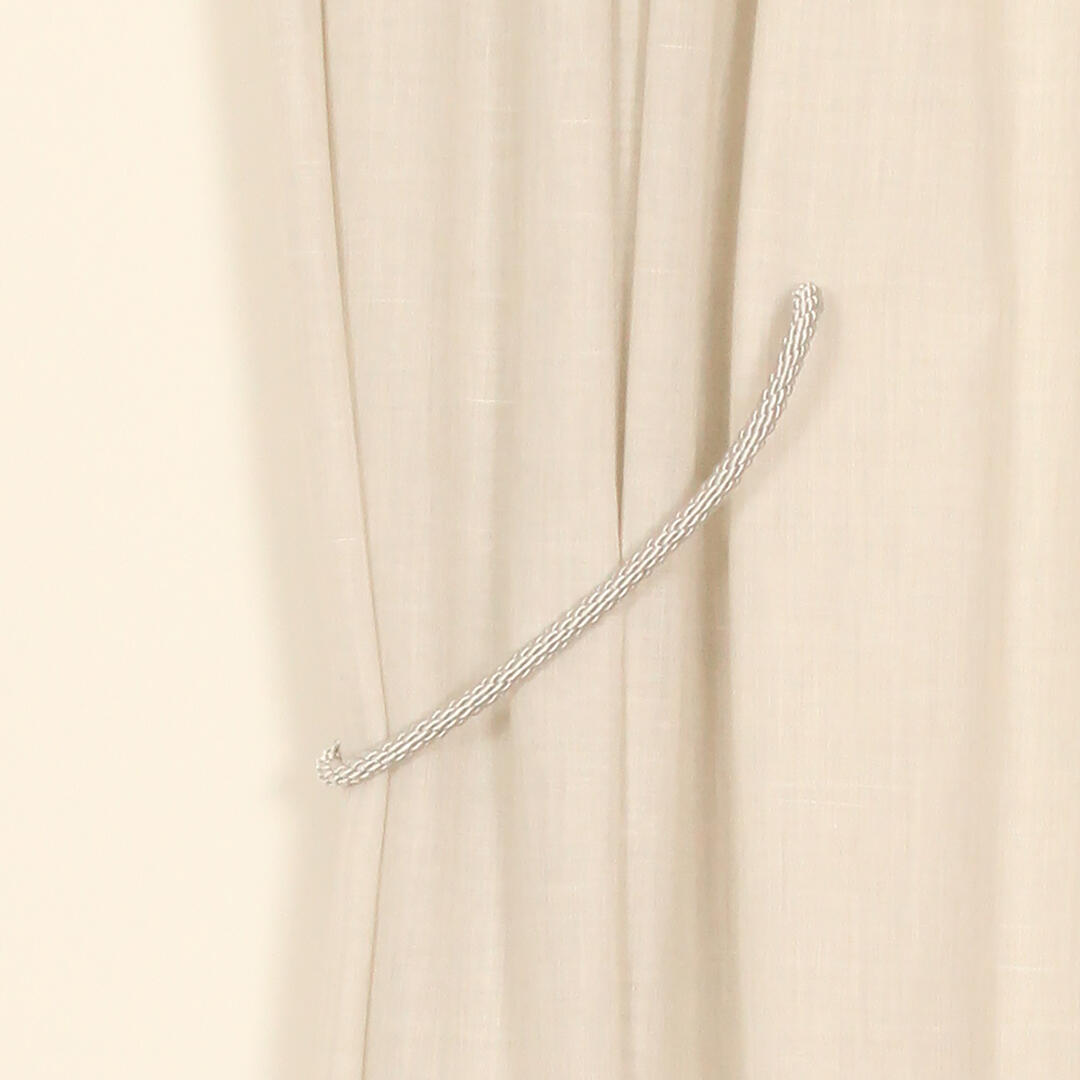 Glanzende embrasse in het grijs. Sluiting door middel van magneten aan de uiteinden. Kan zowel met als zonder embrassehaak gebruikt worden. Gemaakt van een dik gedraaid koord. De volledige lengte van de embrasse is 59cm incl. magneet.