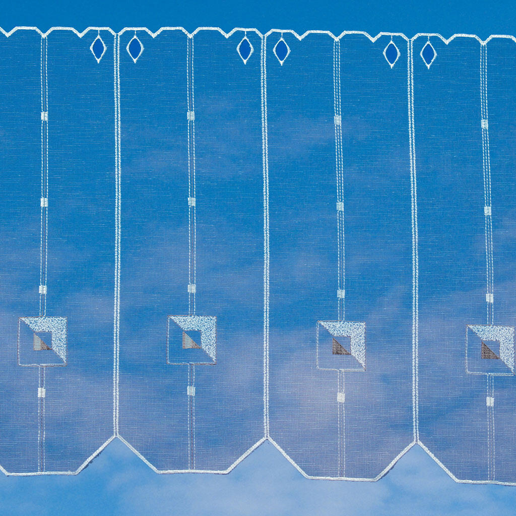 Transparante witte val in opengeweven structuur. Met streeppatroon in wit/zwart/grijs. De gemiddele hoogtevan de val is 50cm.