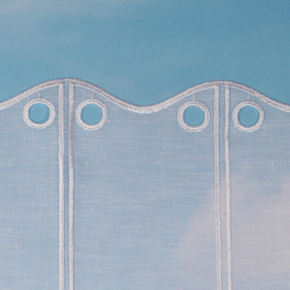 Transparant geweven val in kleur wit. Ieder paneel, van 10,5 cm breed, is voorzien van een geborduurde rand. Onderzijde van de val is afgewerkt met een kanten rand. Bovenzijde voorzien van gestikte rand.