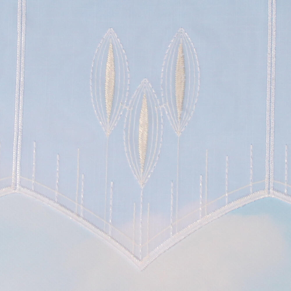 Val in transparante vitragelook. De panelen van deze val zijn geborduurd in een bladvormig patroon met een lichtglanzend wit en creme kleurig garen. Onder- en bovenkant zijn afgewerkt met stompe punten met wit glanzend garen afgezet. De panelen zijn ongeveer 16 cm breed. De gemiddelde hoogte van de val is 45cm .