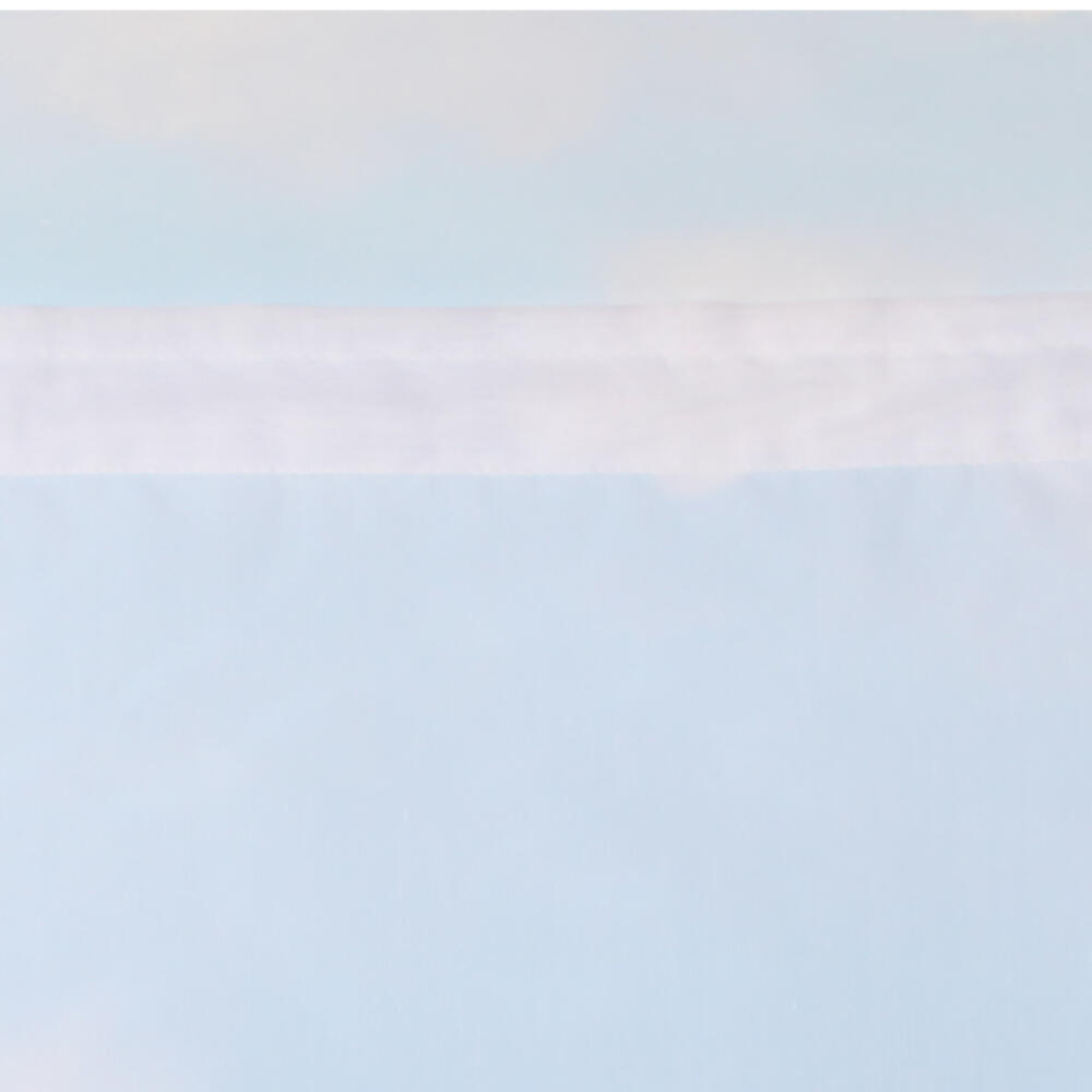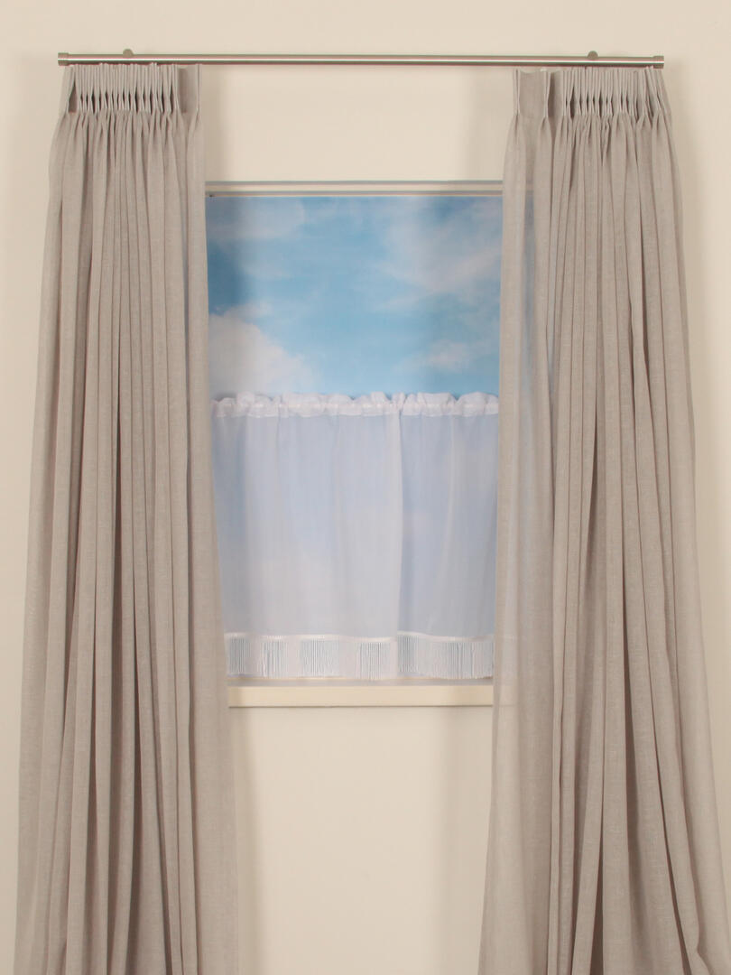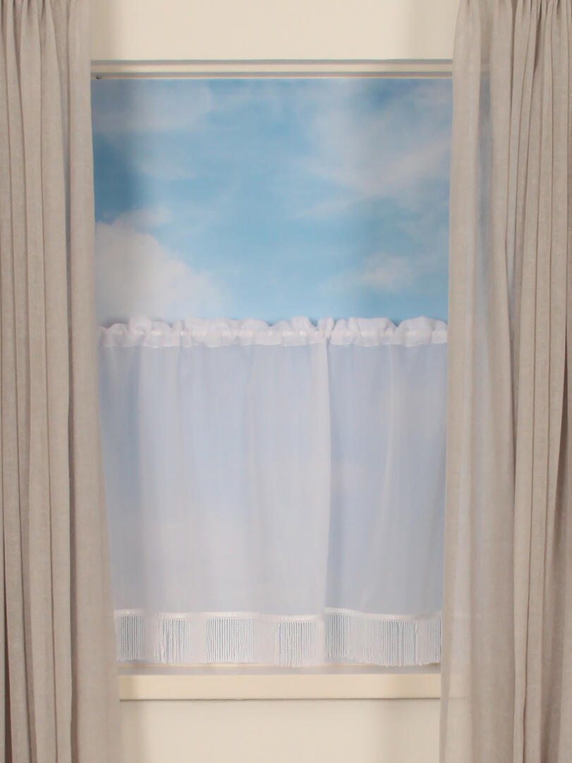 Val Cardona is een witte vitragestof met een fijn streeppatroon en met een rechte franjeband van ongeveer 8 cm. Aan de bovenkant van de franjeband lijkt het of er een dubbele satijnlint doorheen geregen zit