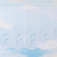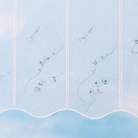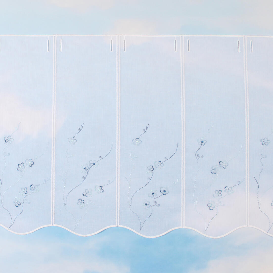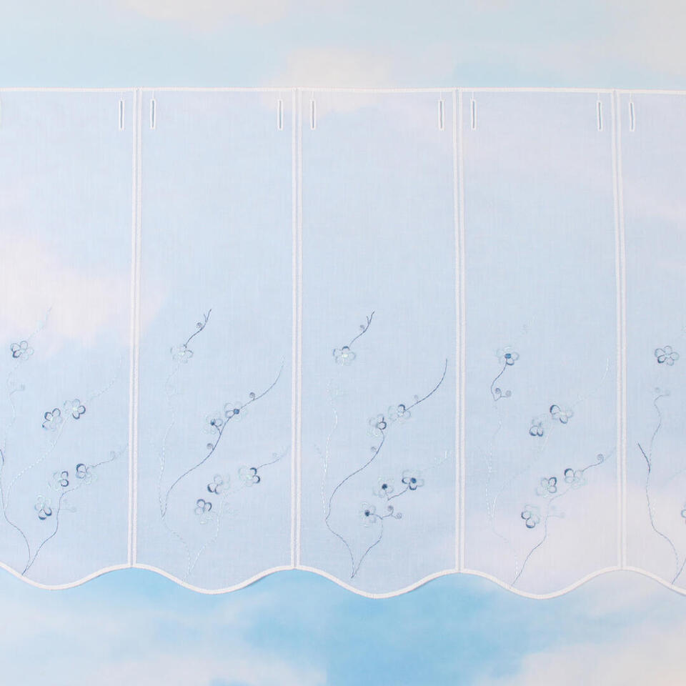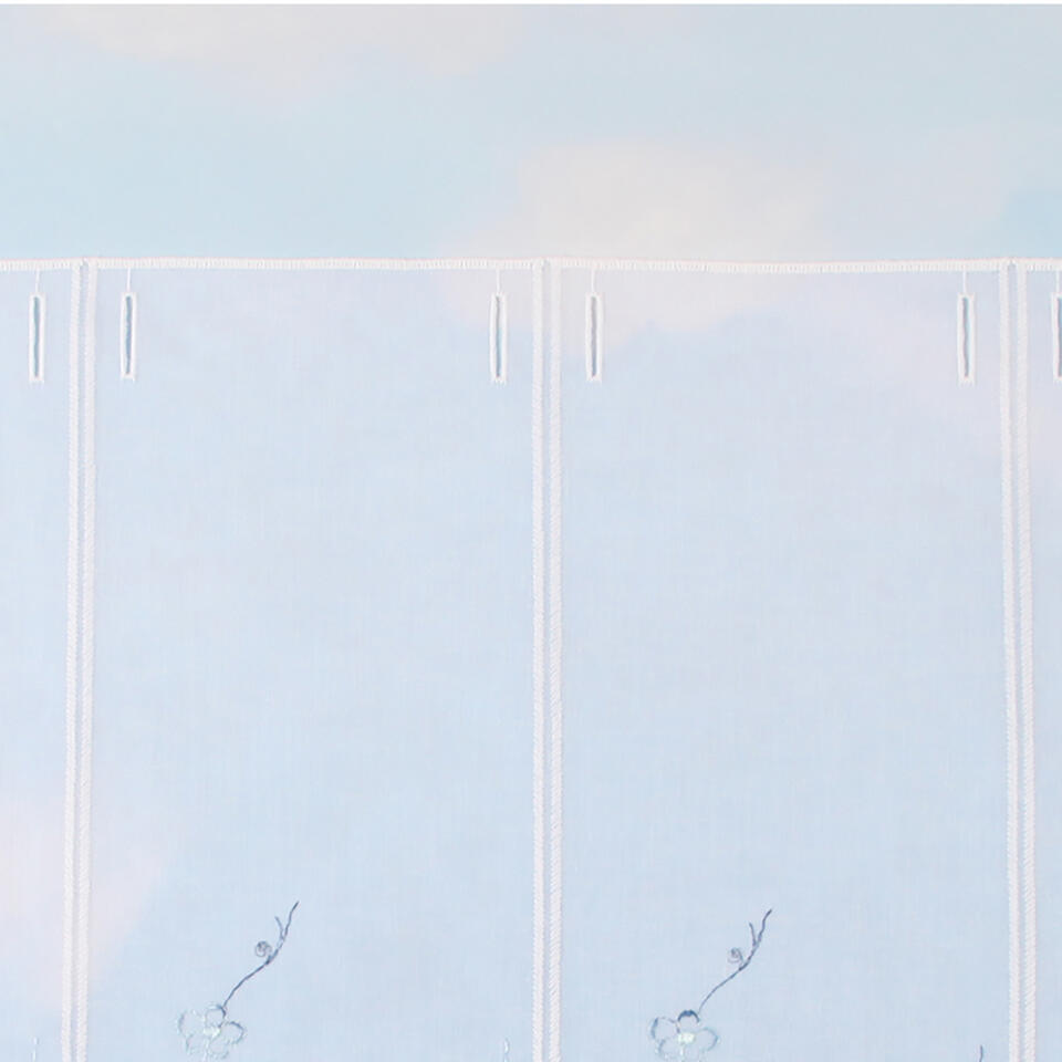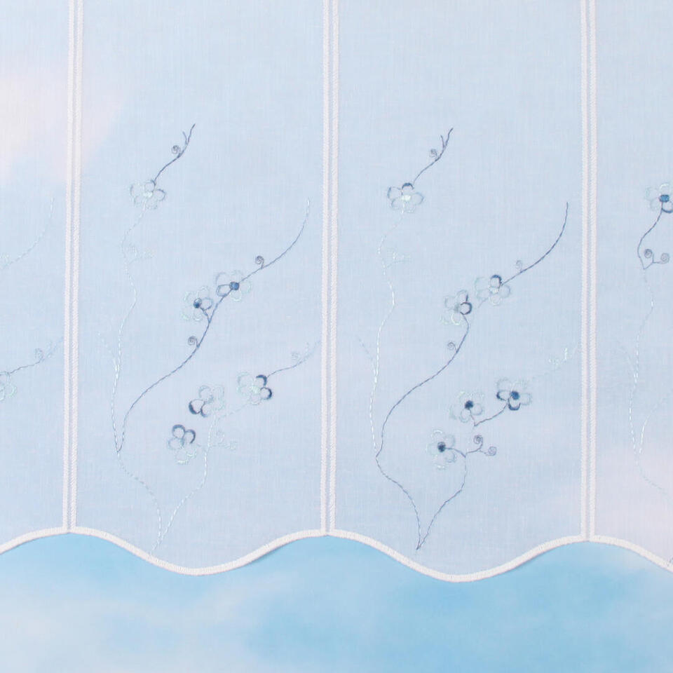 Val Florette blauw is gemaakt van een vitrage met een subtiele weefstructuur. De panelen zijn rondom afgewerkt met een witte garen. Op ieder paneel zijn blauwe takken met kleine bloemen geborduurd. In het blauwe glansgaren zit een verloop van verschillende blauwtinten. Deze val is geschikt voor roedes tot 15mm doorsnee.
