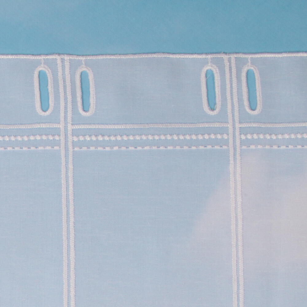 Val Grafik is een val van witte vitragestof. Hij betaat uit wat smallere sigmenten die rondom zijn afgewerkt met glanzend garen. Zowel boven als onder is hij versierd met een geborduurde border van strepen en ruiten. In de ruitjes is hij opengewerkt. De sigmenten zijn 10,5 cm breed.