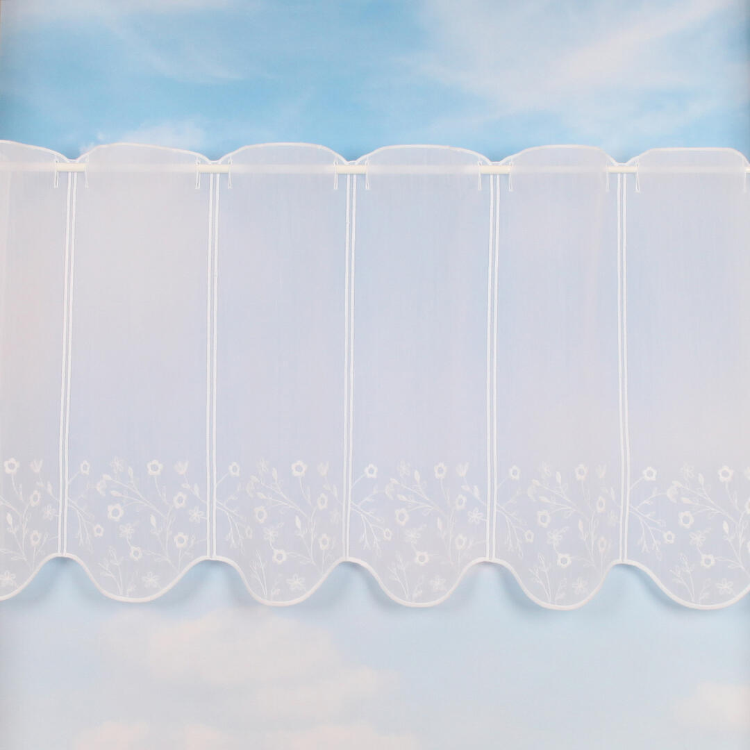 Deze transparante val is aan de onderkant afgewerkt met een sierlijk bloemenpatroon. Deze zijn geborduurd met een matte garen. De segmenten zijn 15,5 cm breed. De val heeft heel licht een verticale structuur in de stof.