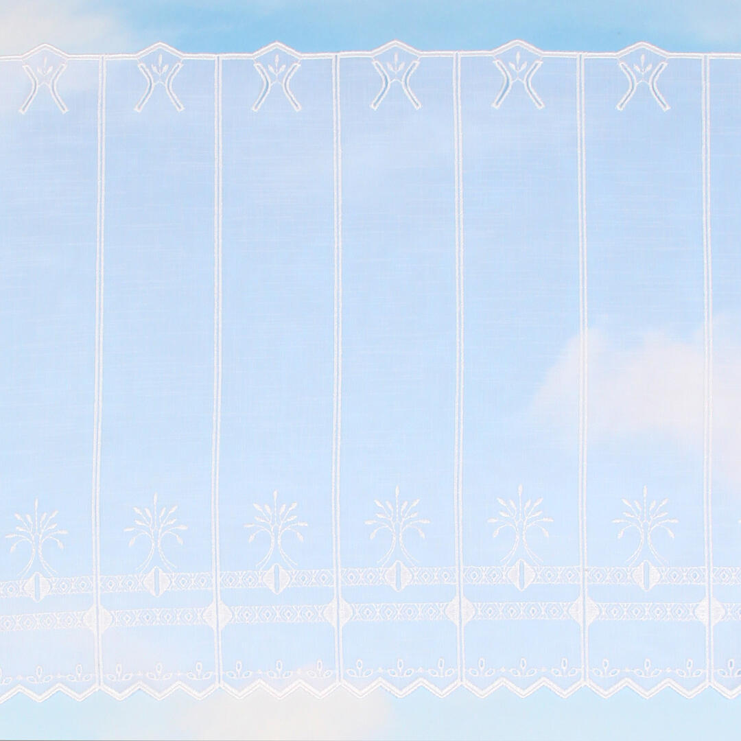 Deze val is van een zeer transparante stof waarin duidelijk een weefstructuur te zien is. De onderkant van deze val is afgewerkt met een geborduurde borderrand. Op ieder segment is boven de borderrand een boompje geborduurd. De segmenten zijn 8 cm breed. Val Lyss is ook verkrijgbaar in lengte 30 cm.