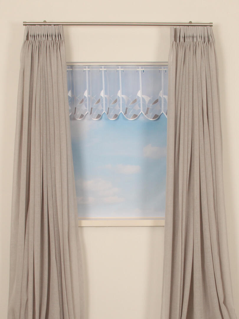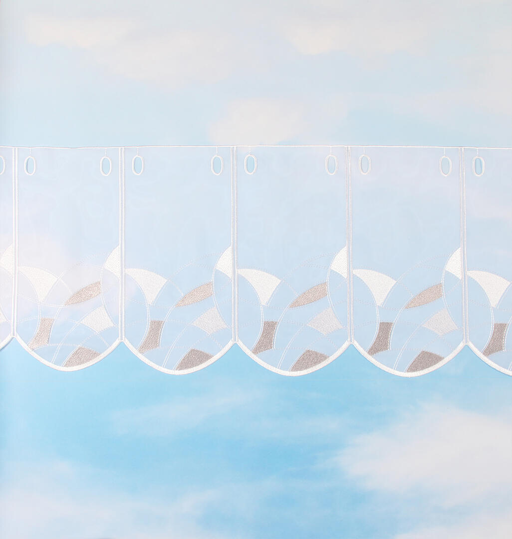 De basis van deze val is gemaakt van een soepele witte voile. De segmenten van 16 cm breedte, zijn rondom afgewerkt met een witte glansgaren. De onderkant is voorzien van een grafisch patroon, geborduurd in witte en grijze garens. Deze val is geschikt voor roedes met een doorsnee tot 15mm.