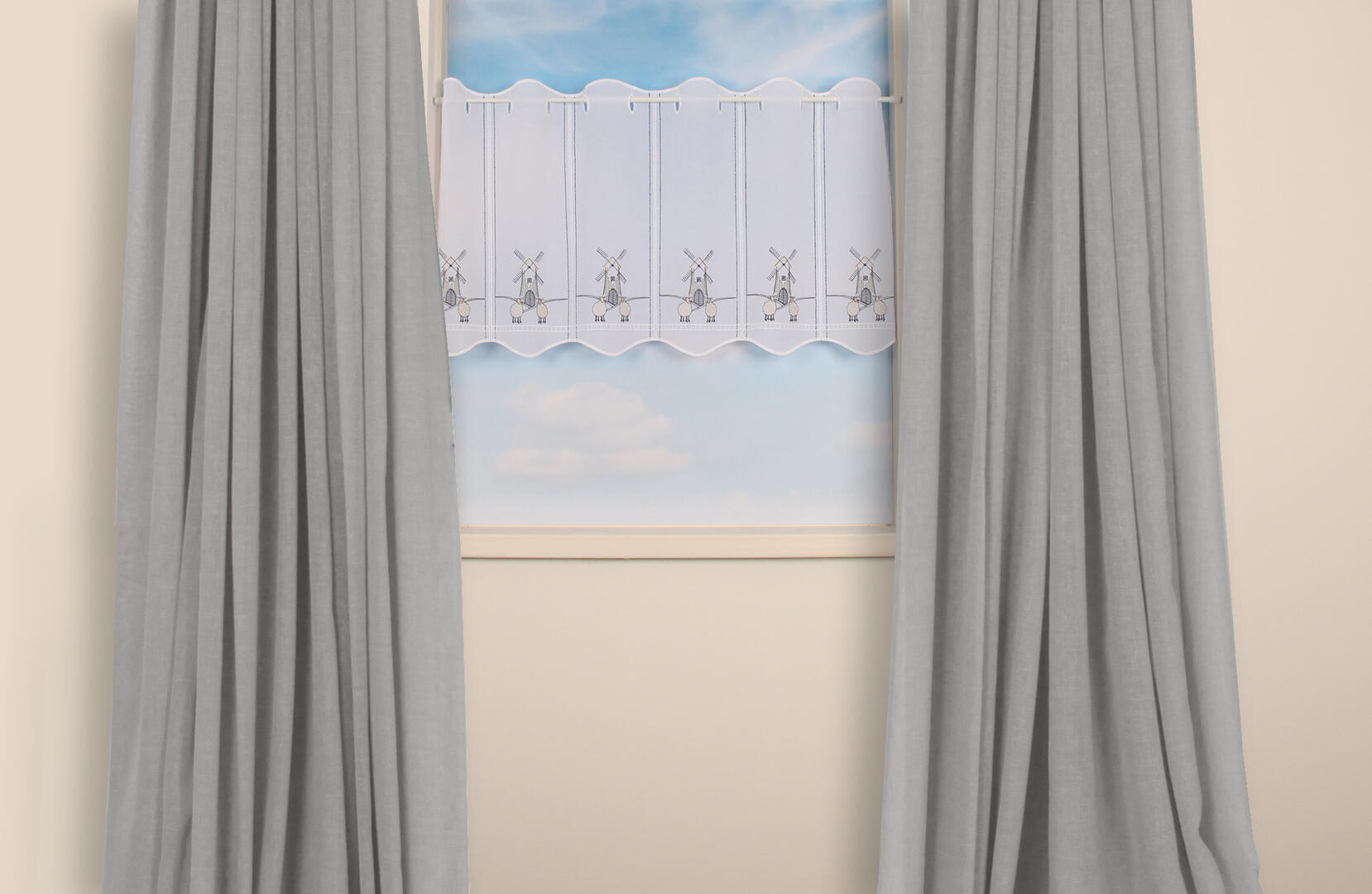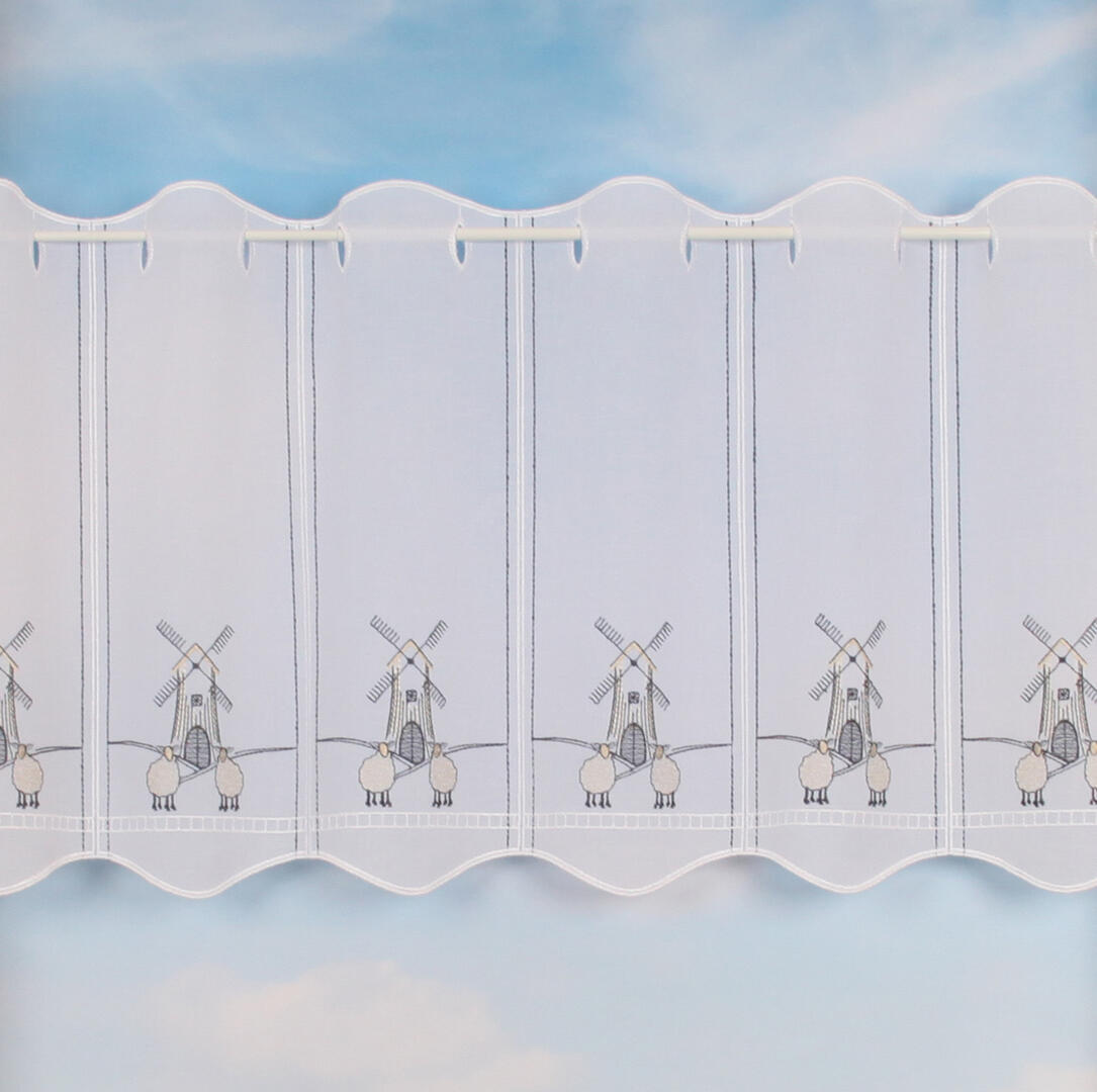 Deze soepele transparante val heeft op ieder sigment een borduursel van een molen met schapen. Deze zijn geborduurd met de kleuren zwart, creme en champagne. De sigmenten zijn afgezet met een glanzend wit garen. De val is aan boven- en onderkant afgewerkt met een golvende rand. De golf steekt ongeveer 5 cm boven de roede uit. Deze val is ook verkrijgbaar in 30 cm hoogte.