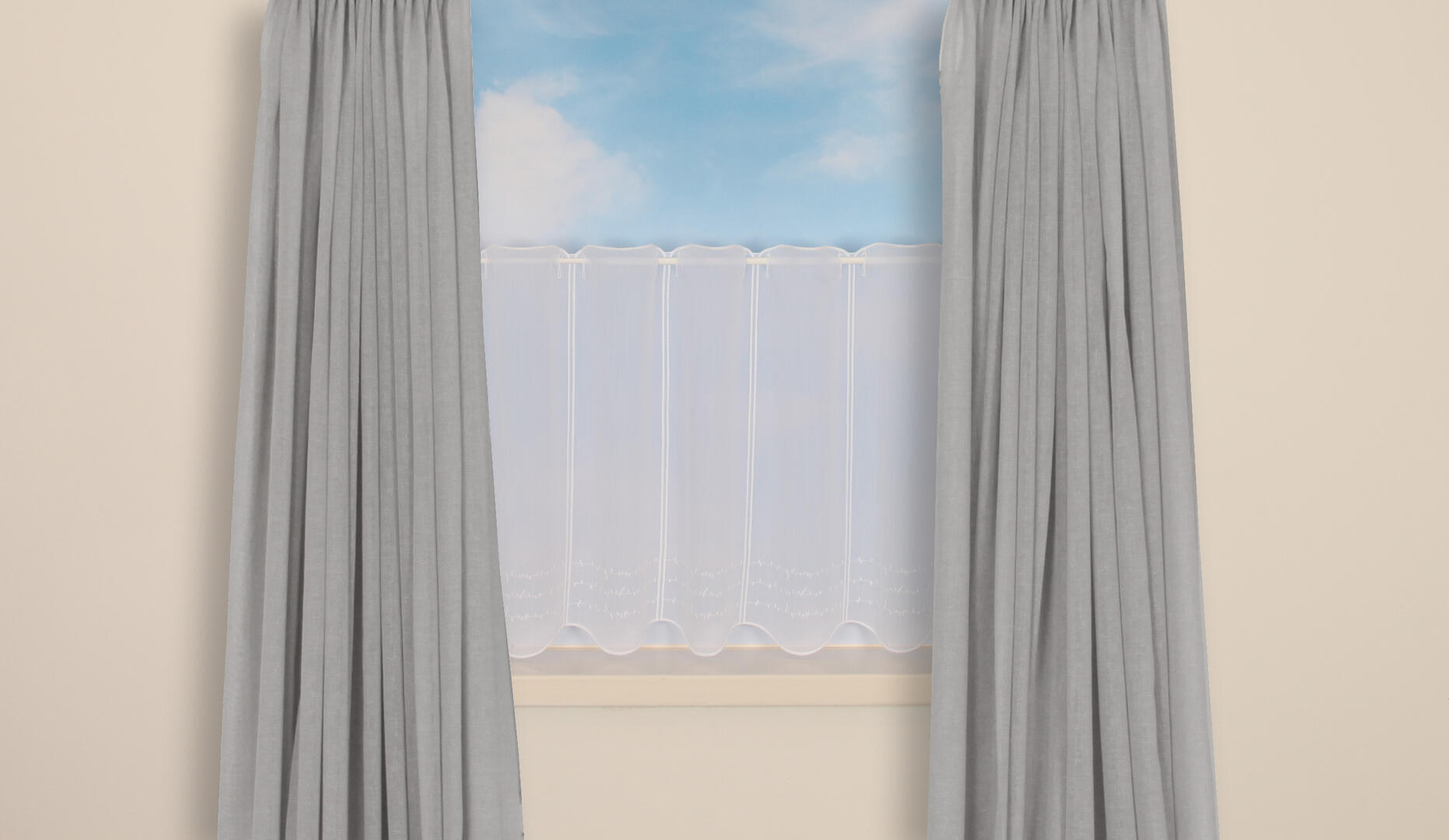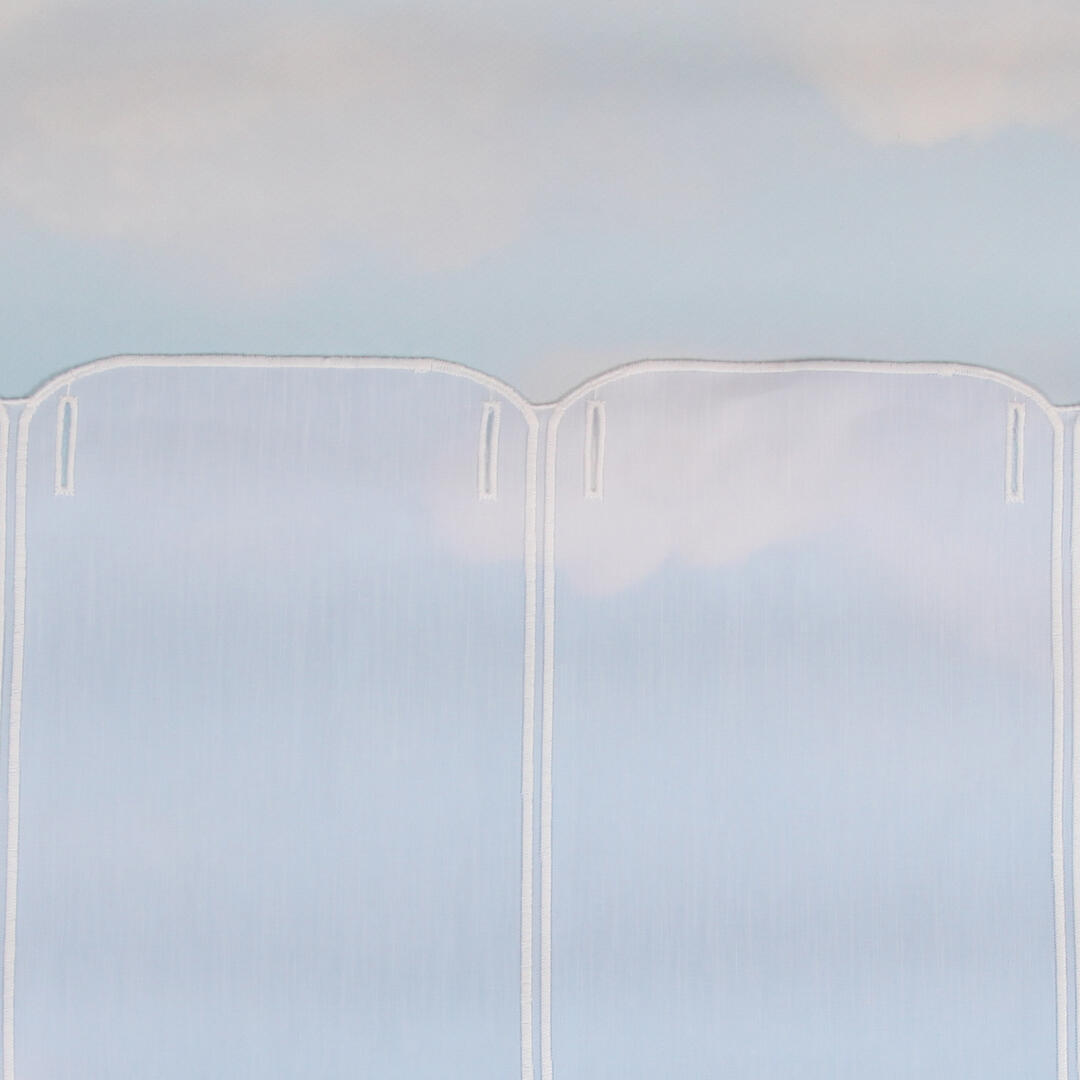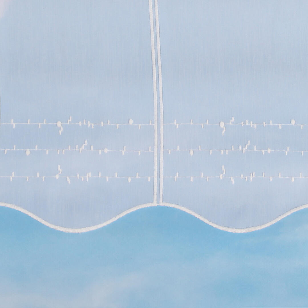 Deze transparante val bestaat uit segmenten van 15,5 cm breedte. Aan de onderkant is hij voorzien van een geborduurde borderrand met een abstract patroon.