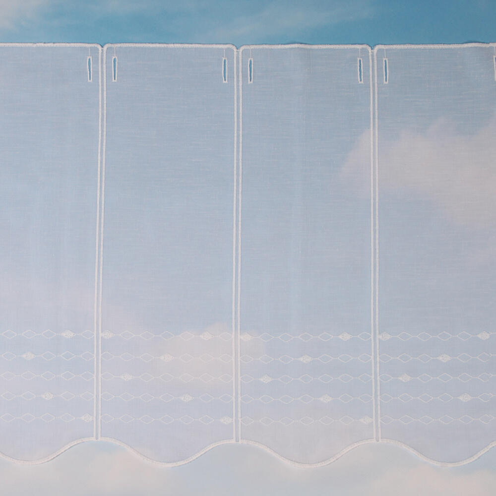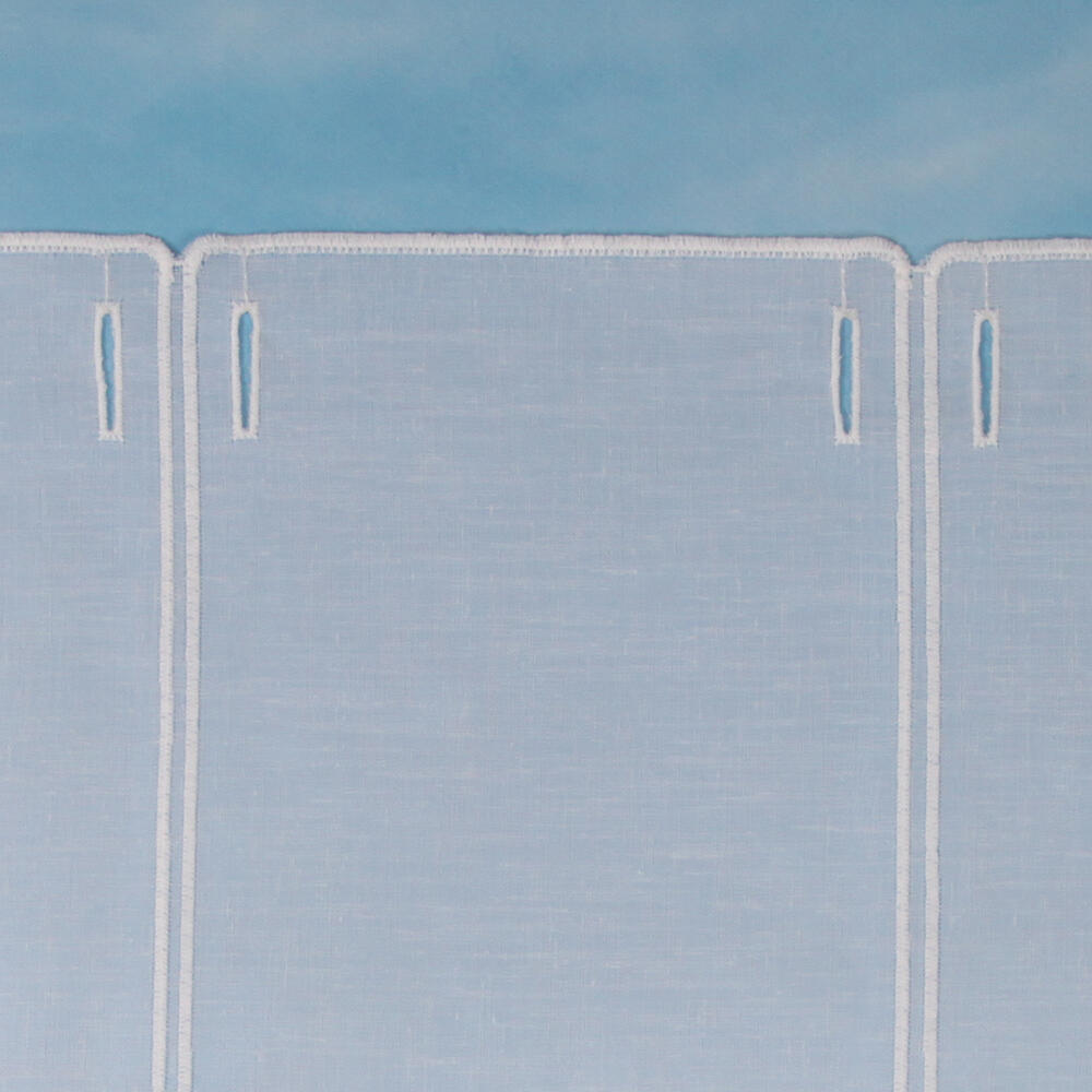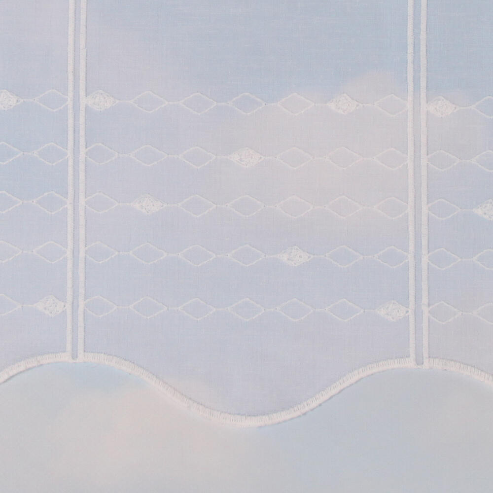 Val van panelen met een borduurrand. Over de onderzijde loopt een geborduurde border van kleine ruitjes .Verder is de val effen. Ieder paneel heeft een breedte van ongeveer 16cm. De volledige hoogte van de val is ongeveer 50cm. Boven de doorsteek opening zit een hoogte van 1,5cm, dit is inbegrepen bij de totale hoogte.