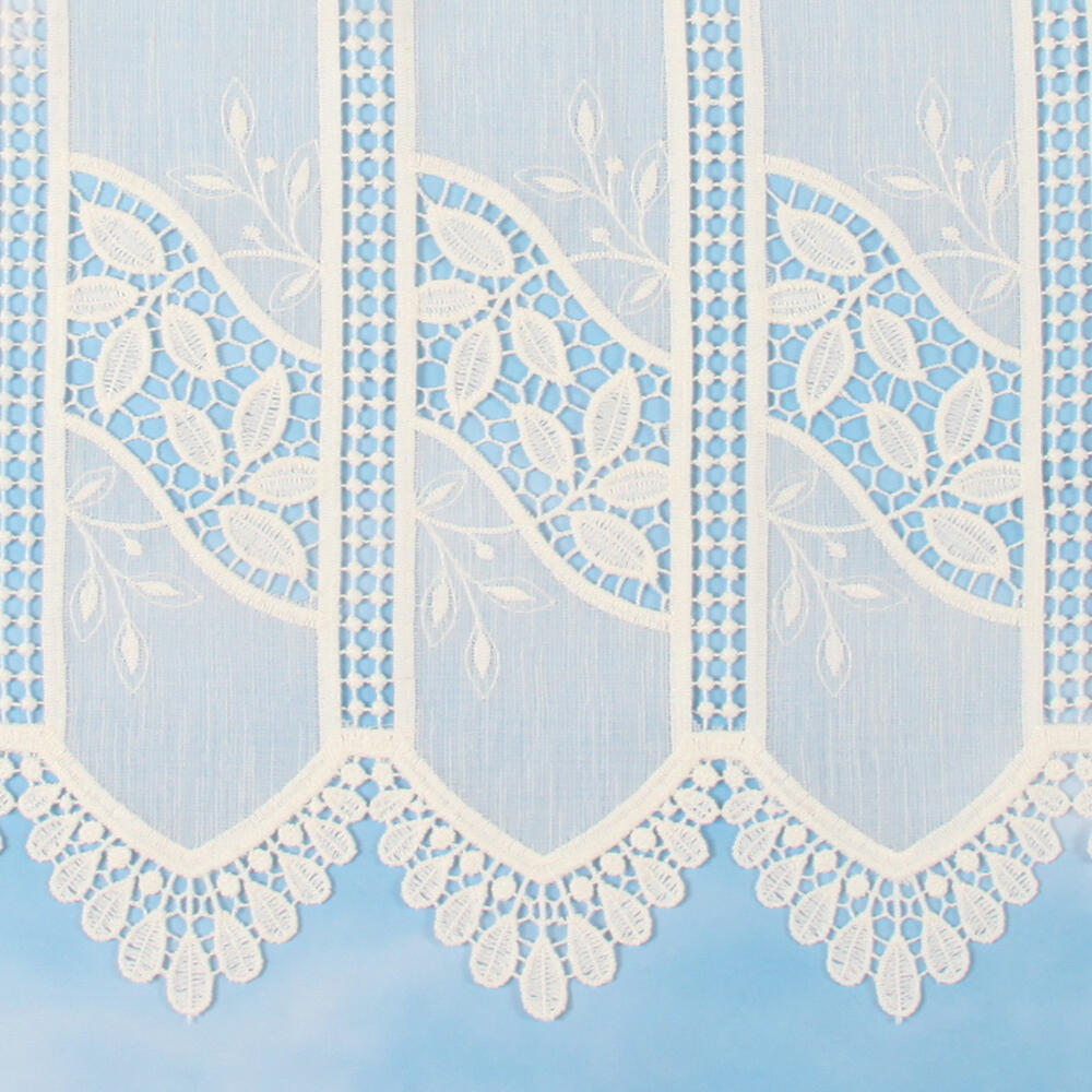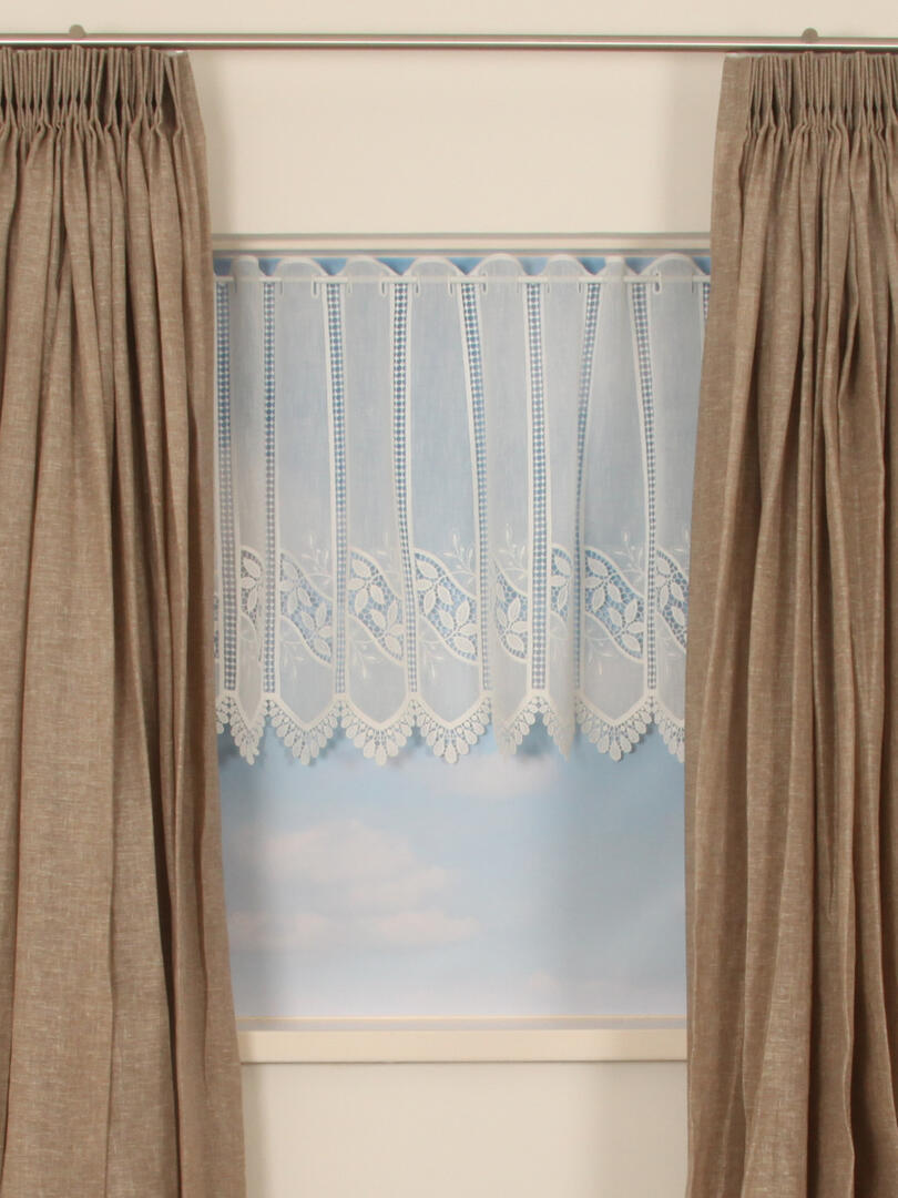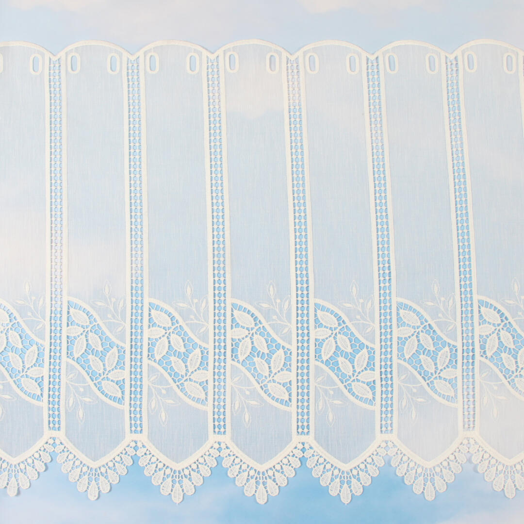 Soepelvallende val Stern in een offwhite grof geweven stof met geschupte kanten randen. Tussen de panelen van 10 cm zit een verticale kanten rand. Elk paneel heeft een schuine kanten bloemmotief en geborduurde blaadjes op de grof geweven stof.