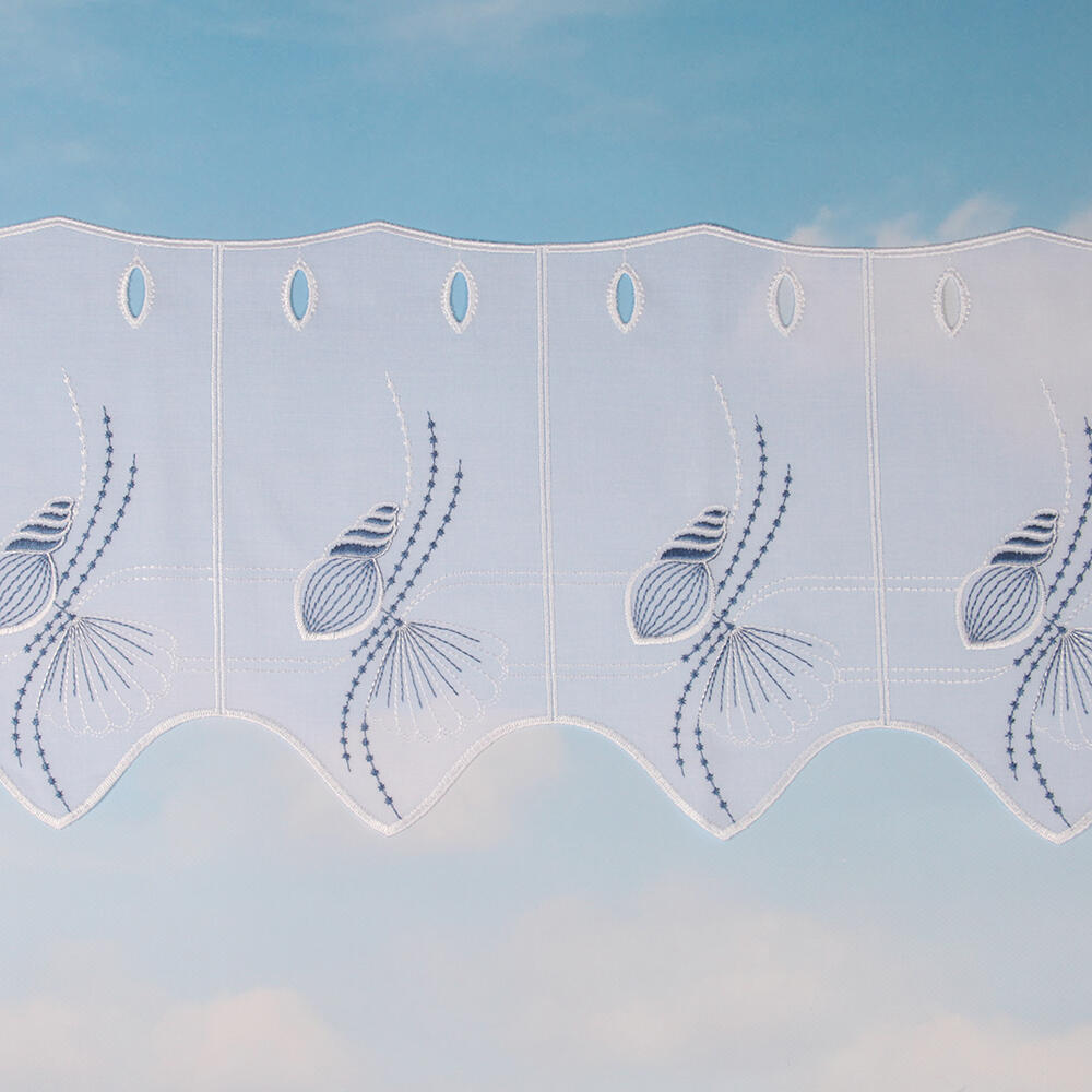 Panelen val van witte dikkere vitrage. Ieder paneel is afgewerkt met geborduurde randen in wit glansgaren. Aan de onderzijde van het paneel zit een borduursel van een schelp met plant in wit en blauwe glansgaren. De panelen hebben een breedte van 18cm en zijn aan de onderzijde golvend. De val heeft een totale hoogte van ongeveer 30cm. De hoogte boven de doorsteek opening is 20mm, deze hoogte zit bij de totale hoogte in.