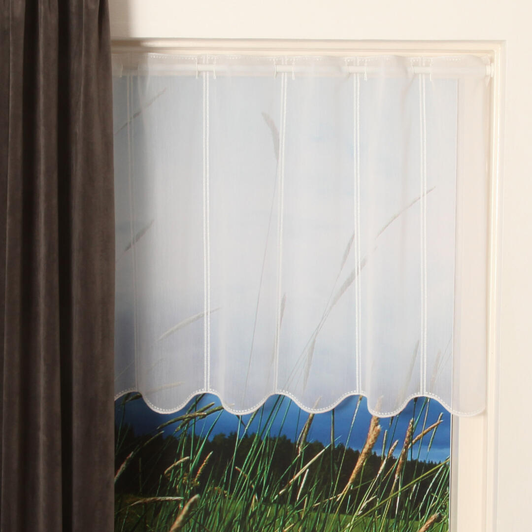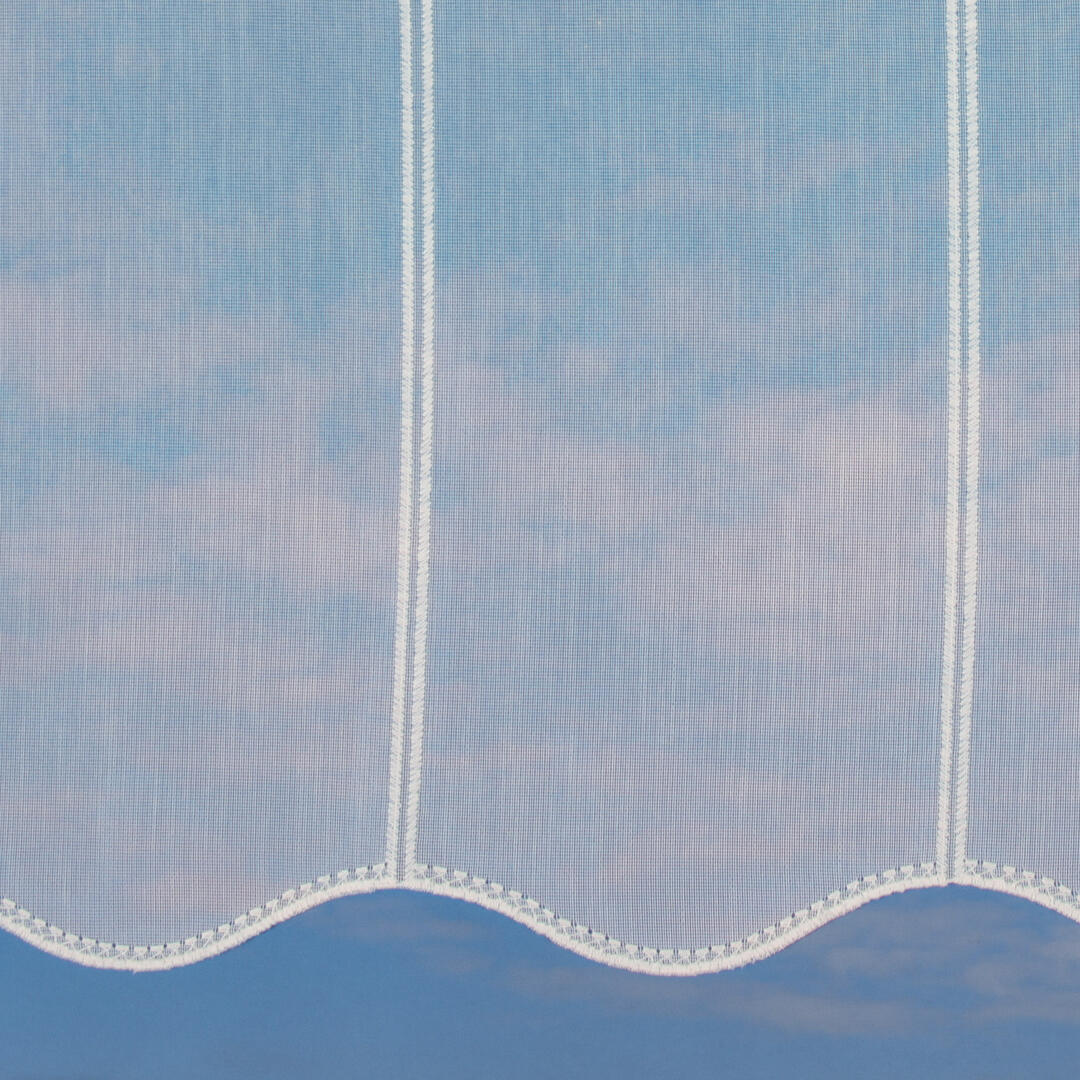 Val van panelen met een borduurrand. De rand aan de onder en bovenzijde heeft klein decoratief stiksel maar verder is de val effen. De panelen zijn geweven in een steviger stof met een lengteweving. Ieder paneel heeft een breedte van ongeveer 16cm. De volledige hoogte van de val is ongeveer 60cm. Boven de doorsteek opening zit een hoogte van 1,5cm, dit is inbegrepen bij de totale hoogte.