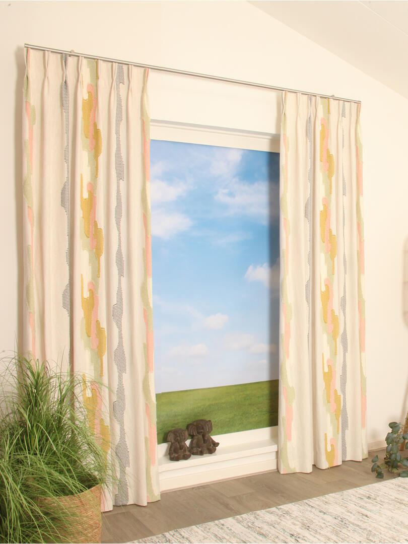 Rhyl (BM Akeru) is een kamerhoog geweven jacquard stof met een uniek dessin. De mix van texturen en de elegante kleurencombinatie brengen een stijlvolle uitstraling in jouw interieur. Om het dessin goed uit te laten komen is een enkele plooi erg geschikt maar een luxe wave confectie past ook heel goed bij het patroon.