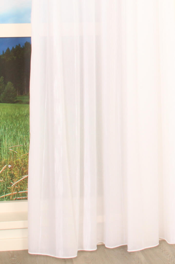 Deze witte stevige vitrage uit onze collectie is wat dichter geweven en voorzien van een patroon van lengtestrepen in wisselende breedtes. De lengtestrepen worden gevormd door dikkere meegeweven garens. Een brede streep van zo'n 3,5cm wordt afgewisseld met een smalle streep van 0,5cm. Deze kamerhoge stof is voorzien van een loodveter en wordt geleverd zonder verticale naden.