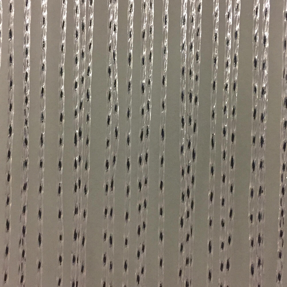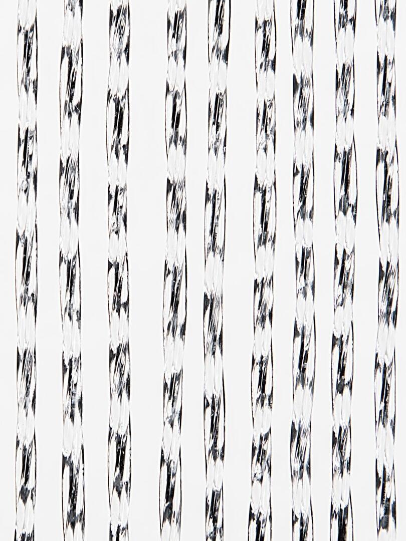 Deurgordijn van transparante PVC strengen met zwarte details in een gevlochten look. Bevestiging met twee kunststof ophang ogen die verschoven kunnen worden.