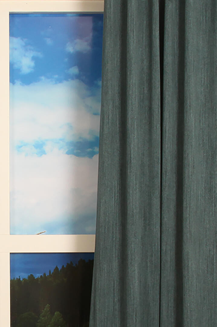 Overgordijn Dusk till Dawn is een gemêleerde verduisterende stof gemaakt van matte garens. De achterkant van deze gordijnstof is effen blauw, kleurend aan de voorkant.