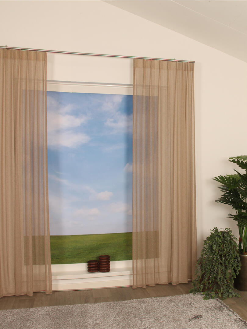 Deze stof is kamerhoog, wat betekent dat deze gordijnen naadloos kunnen worden geconfectioneerd voor een luxe en elegante uitstraling.