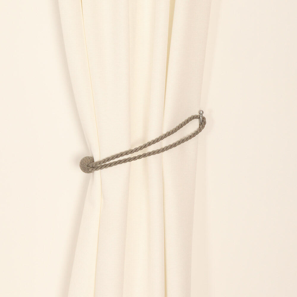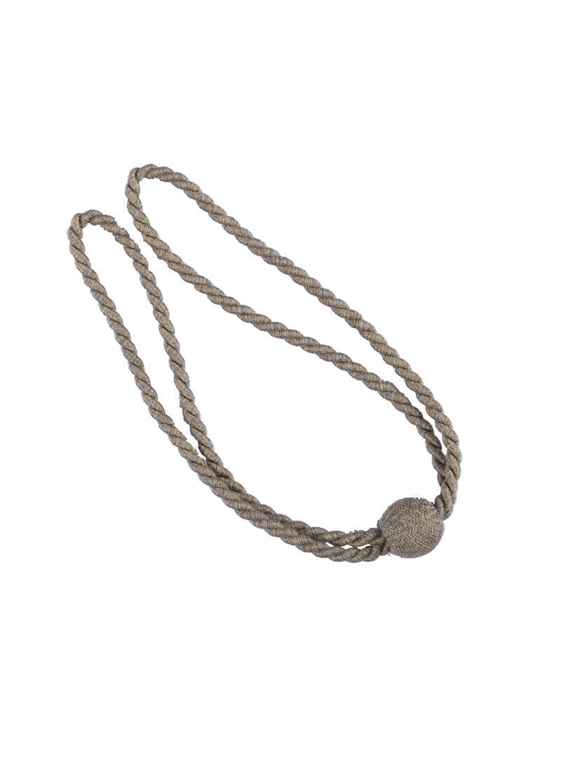 Embrasse van gevlochten koord in een grijsbruine kleur. Door de weving heeft de knop in het midden een gebreide look. De knop in het midden kan niet verschoven worden. Beide uiteinden van de embrasse zijn twee grote lussen voor een gemakkelijke bevestiging aan een embrassehaak. De embrasse heeft een totale lengte (recht gemeten) van 60cm.